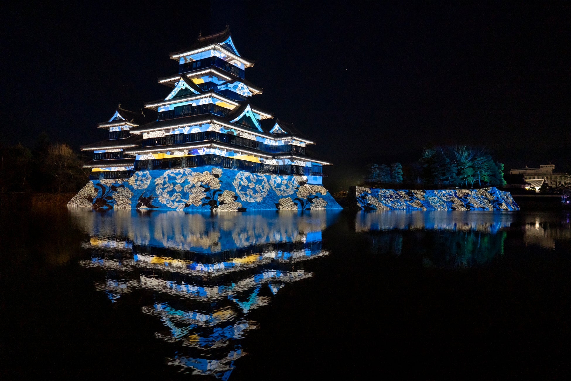 【内容】 現存国宝5天守の一つで五重六階の天守の中で最古の国宝 松本城の天守や石垣に、葛飾北斎や歌川広重による信州ゆかりの浮世絵や豪壮な天守を築いた松本城主・石川数正が描かれた屏風絵が立体的に躍動するデジタルアニメーション、松本てまりや深山織、藍染めなど松本市ならではの伝統工芸をモチーフとしたデジタルアート、春に咲き誇る北アルプスの花々など、ダイナミックで幻想的なプロジェクションマッピング映像を投影します。