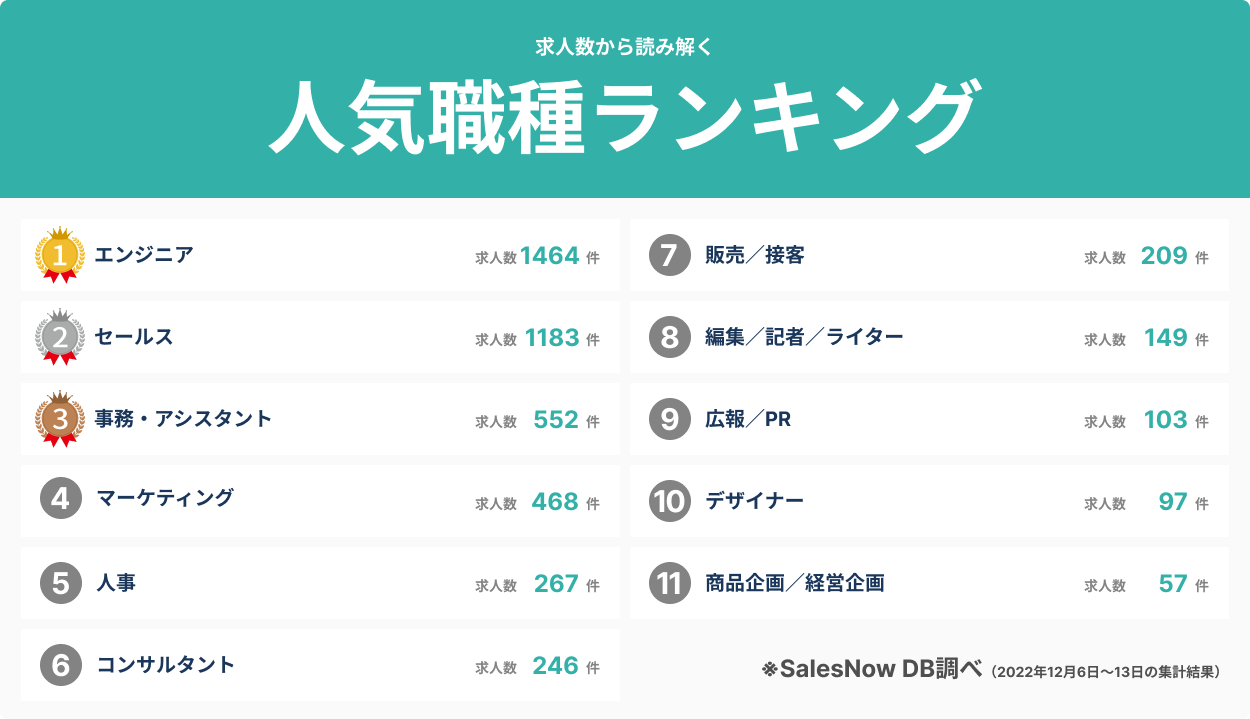日本最大級のデータベースを誇る「SalesNow DB」において、2022年12月6日から13日までの間に掲載された求人数を読み解き、求人数の多い職種ごとに調査しました。
