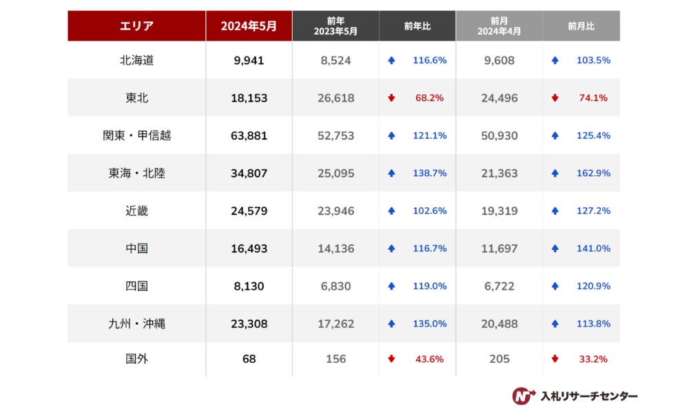 2024年5月のエリア別公示案件数は、東北エリア・国外を除いて全体的に前年より増加傾向となりました。