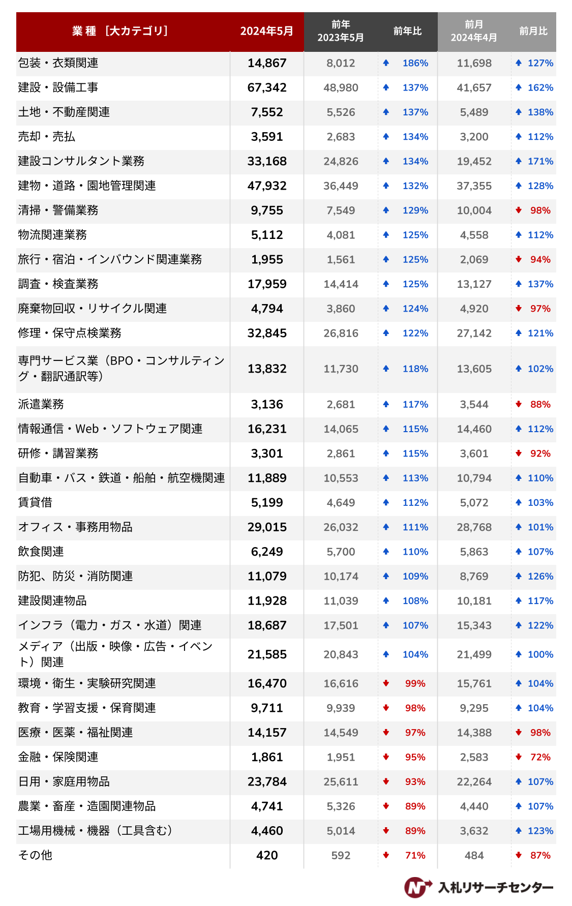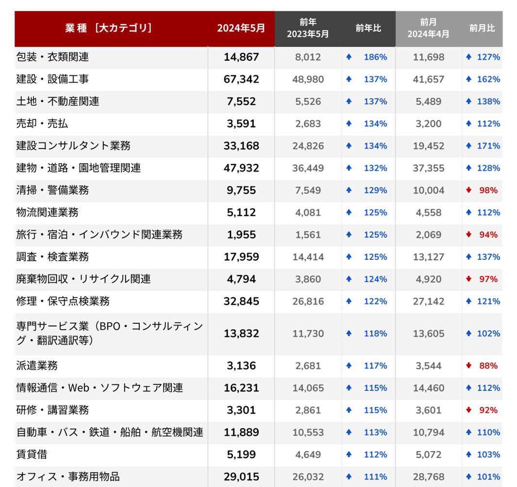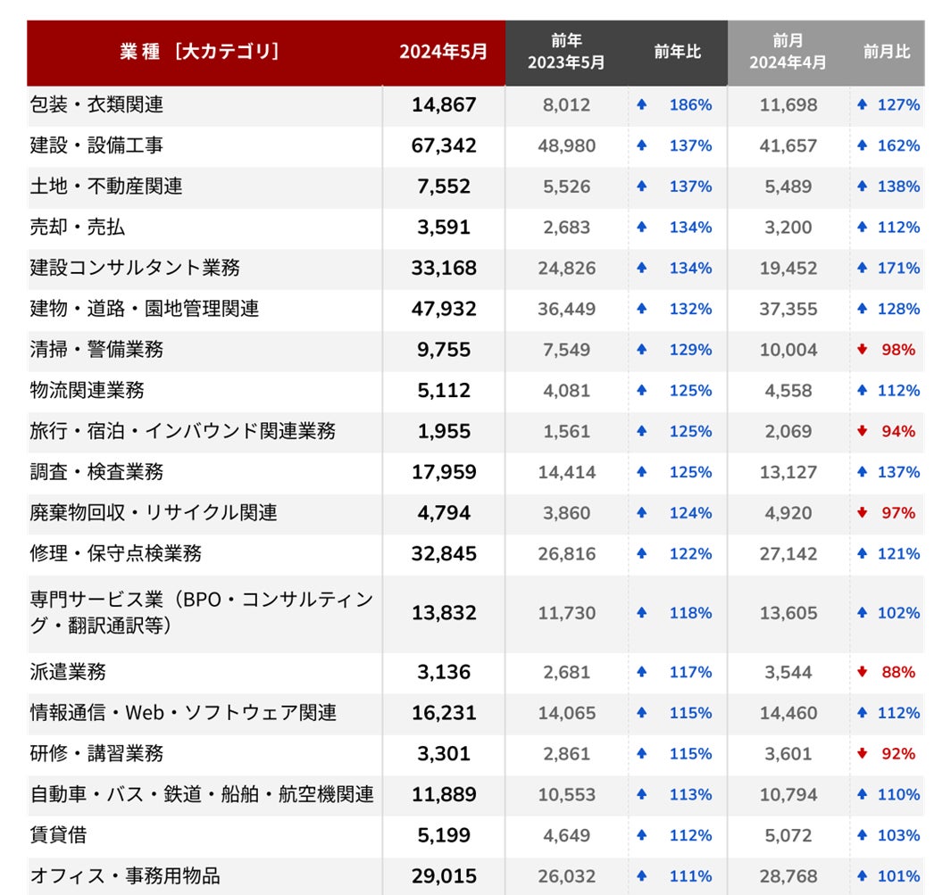 2024年5月の業種カテゴリ別公示案件数は、前年より増加している業種が多い傾向でした。