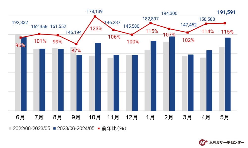 2024年5月の公示案件数の総計は191,591件で、前年比115%となりました。