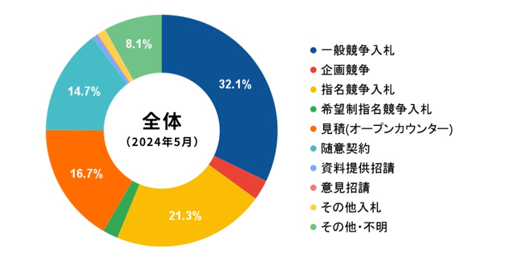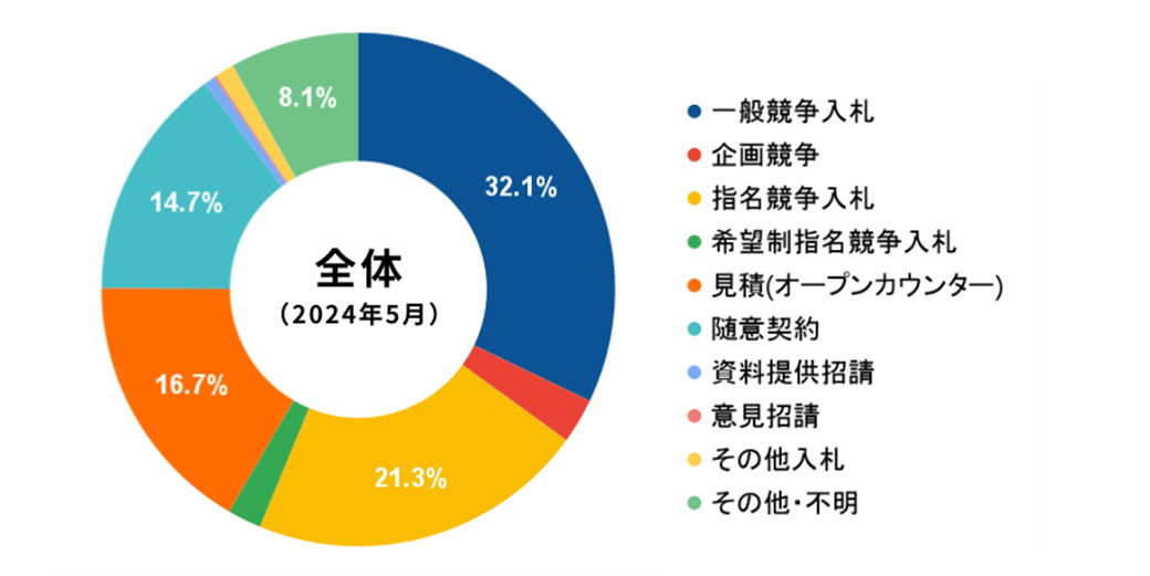 入札形式別の公示案件割合を見ると、「一般競争入札」が32.1%と最も多く、次いで「指名競争入札」(21.3%)が続いています。
