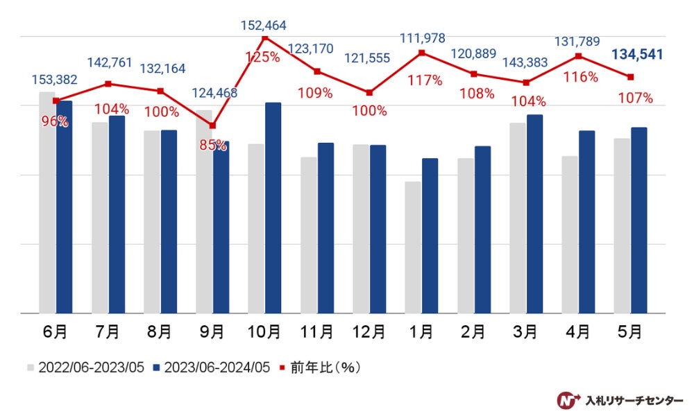 2024年5月の落札案件数の総計は 134,541件で、前年比107%となりました。