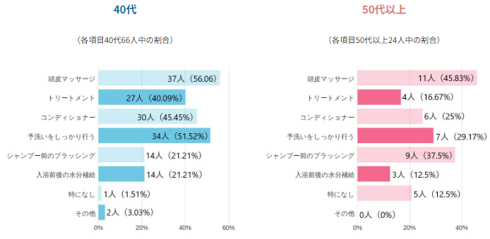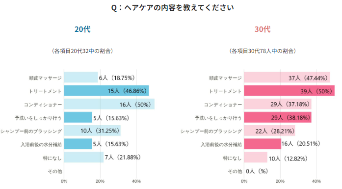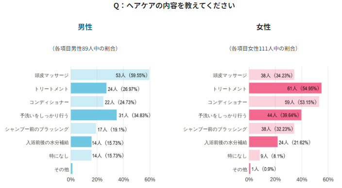 まず男女別に見てみると、女性に比べて男性のほうが頭皮マッサージを行っている割合が高いのに対し、反対に女性は男性よりもトリートメントやコンディショナーを行う割合が大幅に高いという結果となりました。