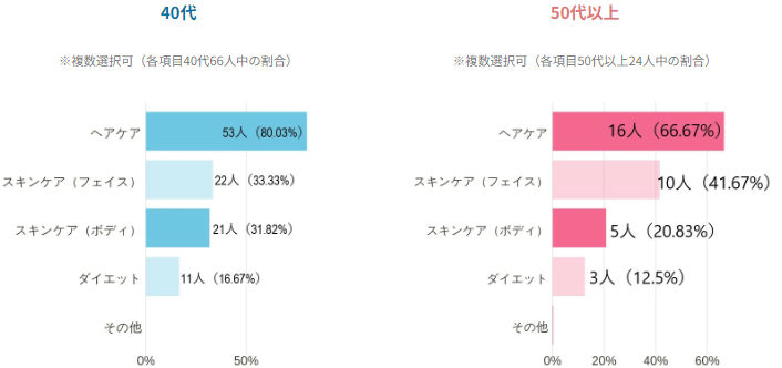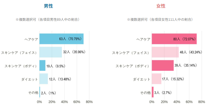 男女別・年代別に見ても非常に高い割合のかたが”ヘアケア”を行っていると回答しています。