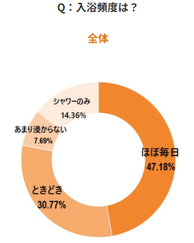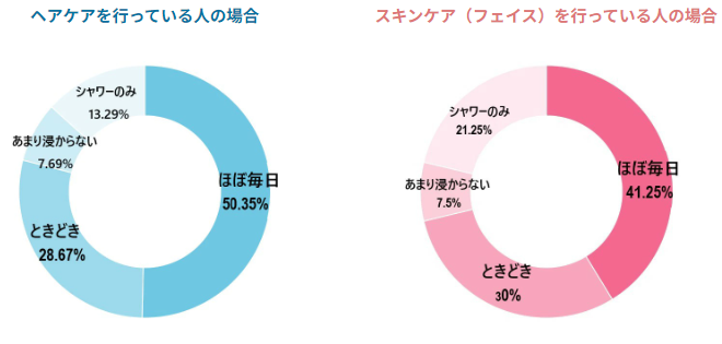 一方スキンケア(ボディ・フェイス)をしている人に関しては、ほぼ毎日浸かる、という人が全体よりも少ない数値となっています。ただ、スキンケア(ボディ)をしている人で”シャワーのみ”というひとは10%と、全体の数値よりも少なく、全く湯船に浸からないというひとは少ないということがわかります。