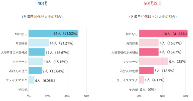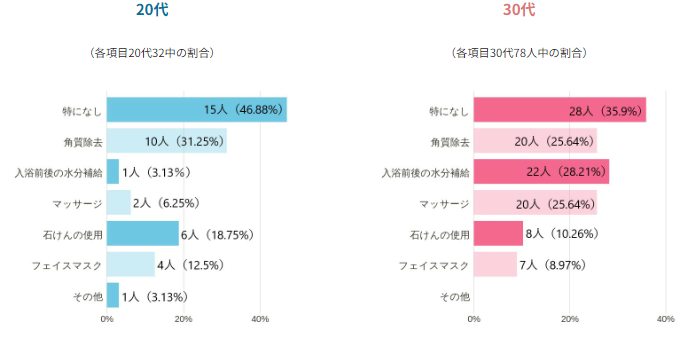 一般に、年齢を重ねるごとにお肌の水分も失われやすくなるため、20代では入浴前後の乾燥を取り立てて気にするひとが、他年代よりも少ないと思われます。