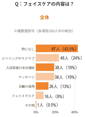 お風呂で行っている美容の第2位であるスキンケア(フェイス)について、細かく内容を見ていくと、一番多くのひとが行っているのがピーリングやスクラブでの角質除去。続いてお肌の乾燥防止のための水分補給、マッサージと続きます。