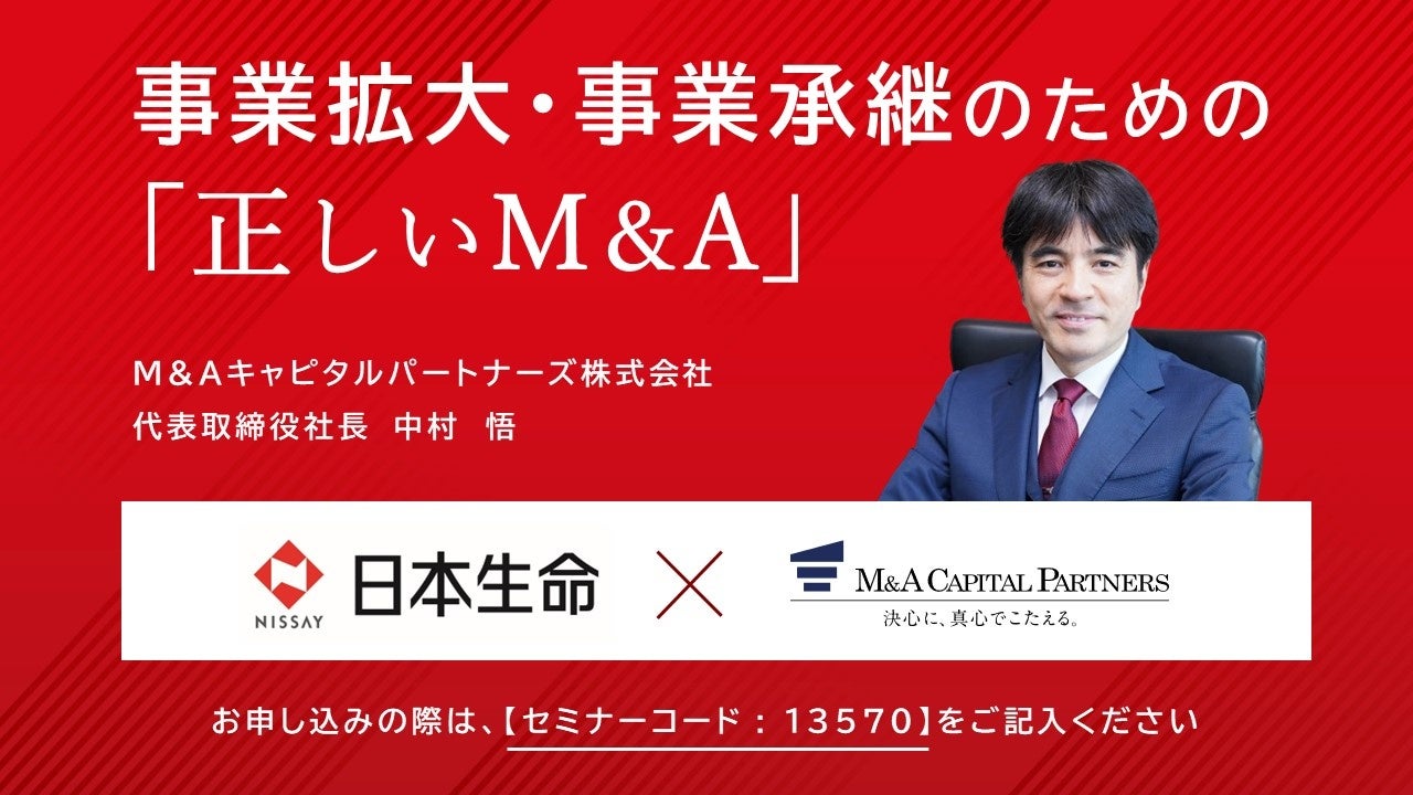 M&Aキャピタルパートナーズ株式会社(東京都中央区・代表取締役社長 中村 悟) は、日本生命保険相互会社と共催で5月17日(金)~7月31日(水)の期間限定で、事業拡大・事業承継のためのM&Aセミナーを開催いたします。