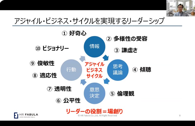 当協会 認定ファシリテーター 山崎一郎との対談では、10個のリーダー資質を実現するために、何が必要かをさらに深堀りしました。なぜこの10個を定義する必要があったのか、その背景にある「上司と部下のコミュニケーション不足」、組織の空気感が生まれにくい現状、「好奇心のなさ」や「視野の狭さ」への危機感といった現場感から、本を執筆しようと思った原体験や、10個のポイントをどう習慣に落とし込むかといった実践のヒントまで語られました。