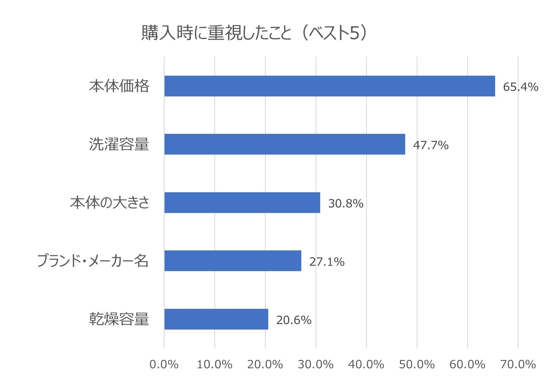 ドラム式洗濯乾燥機の購入時に重視したことは「本体価格」 が65.4%と最多。次いで「洗濯容量」(47.7%)「本体の大きさ」(30.8%)という結果に(複数回答)。
