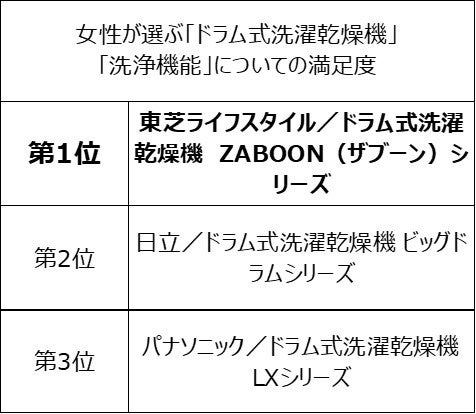 2022年10月に実施した調査において、「パナソニック/ドラム式洗濯乾燥機 LXシリーズ」が女性が選ぶ「ドラム式洗濯乾燥機」利用率第1位に。同商品は総合満足度、オススメ率も第1位で三冠を達成しました。 「東芝ライフスタイル/ドラム式洗濯乾燥機 ZABOON(ザブーン)シリーズ」は「洗浄機能」についての満足度第1位、「パナソニック/ドラム式洗濯乾燥機 Cubleシリーズ」はリピート率第1位を受賞しました。