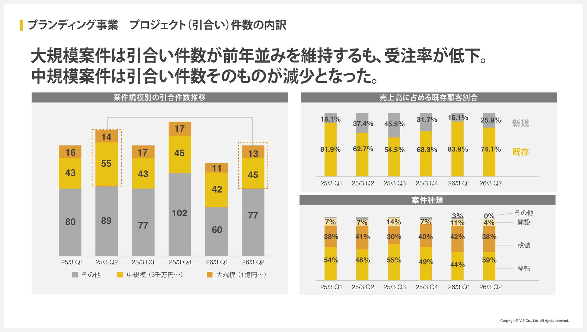 当四半期の引合い件数は135件と、前年同期(158件)に比べて減少しました。大規模案件の引合いは1件減にとどまりほぼ横ばいでしたが、今後受注率の向上が課題となります。