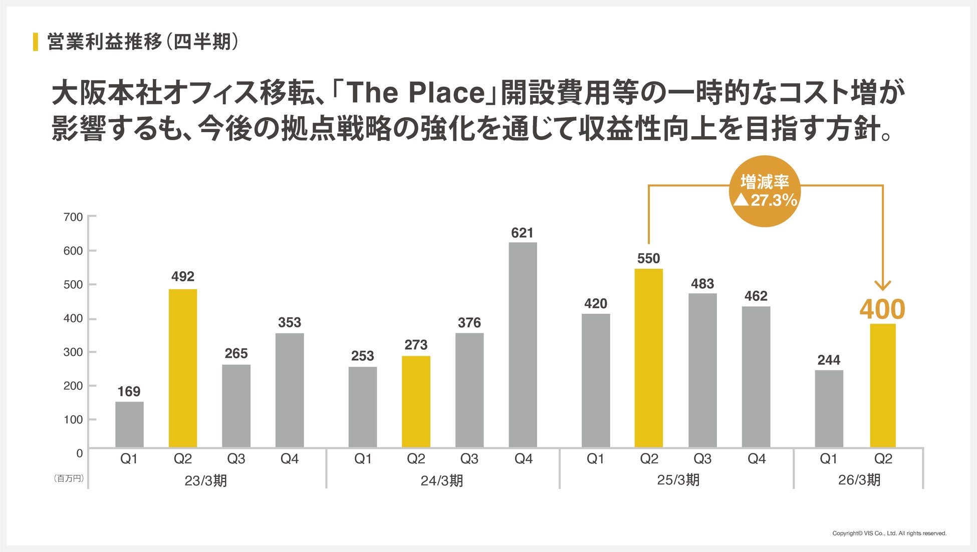 大阪本社のオフィス移転およびThe Place 新橋の開設に伴う一時的なコスト増が影響し、営業利益は前年同期比▲27.3%の400百万円となりました。今後は、拠点戦略の強化を通じて、収益性の向上を図ってまいります。