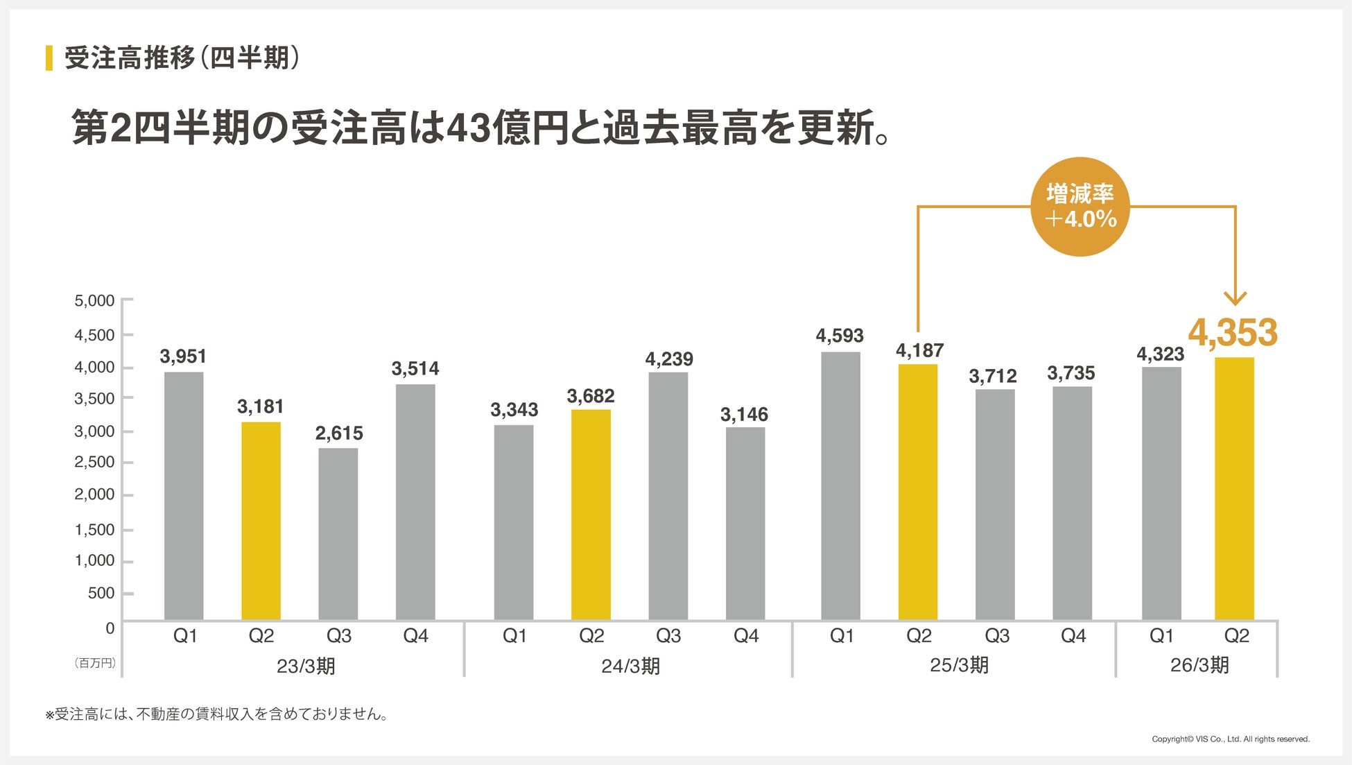 売上高は前年同期比で減少したものの、受注高は4,353百万円(前年同期比+4.0%)と過去最高を更新しました。