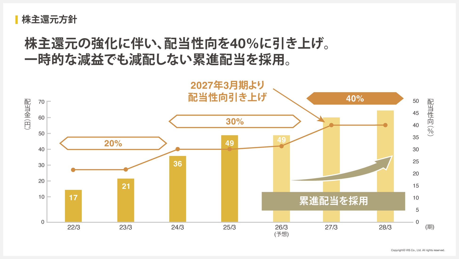 株主還元の強化を目的として、2026年3月期からは一時的な減益があっても減配を行わない累進配当を導入し、2027年3月期からは配当性向を40%へ引き上げることを決定しました。