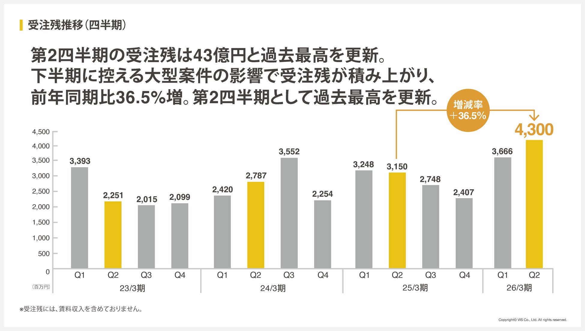 下半期に抱える大型案件の影響で受注残が積み上がり、第2四半期の受注残は前年同期比+36.5%増の43億円と過去最高を更新しました。下半期以降の売上に対する予見性が高まっています。