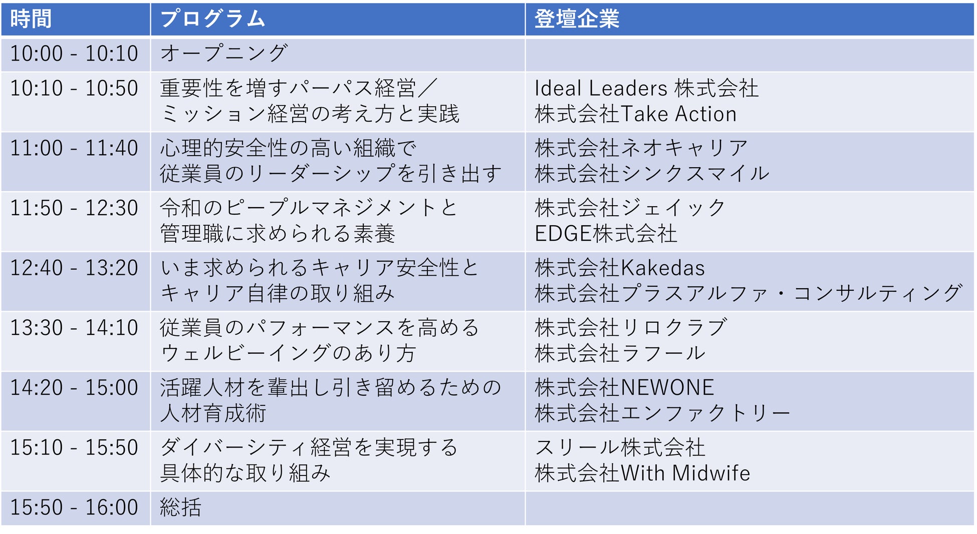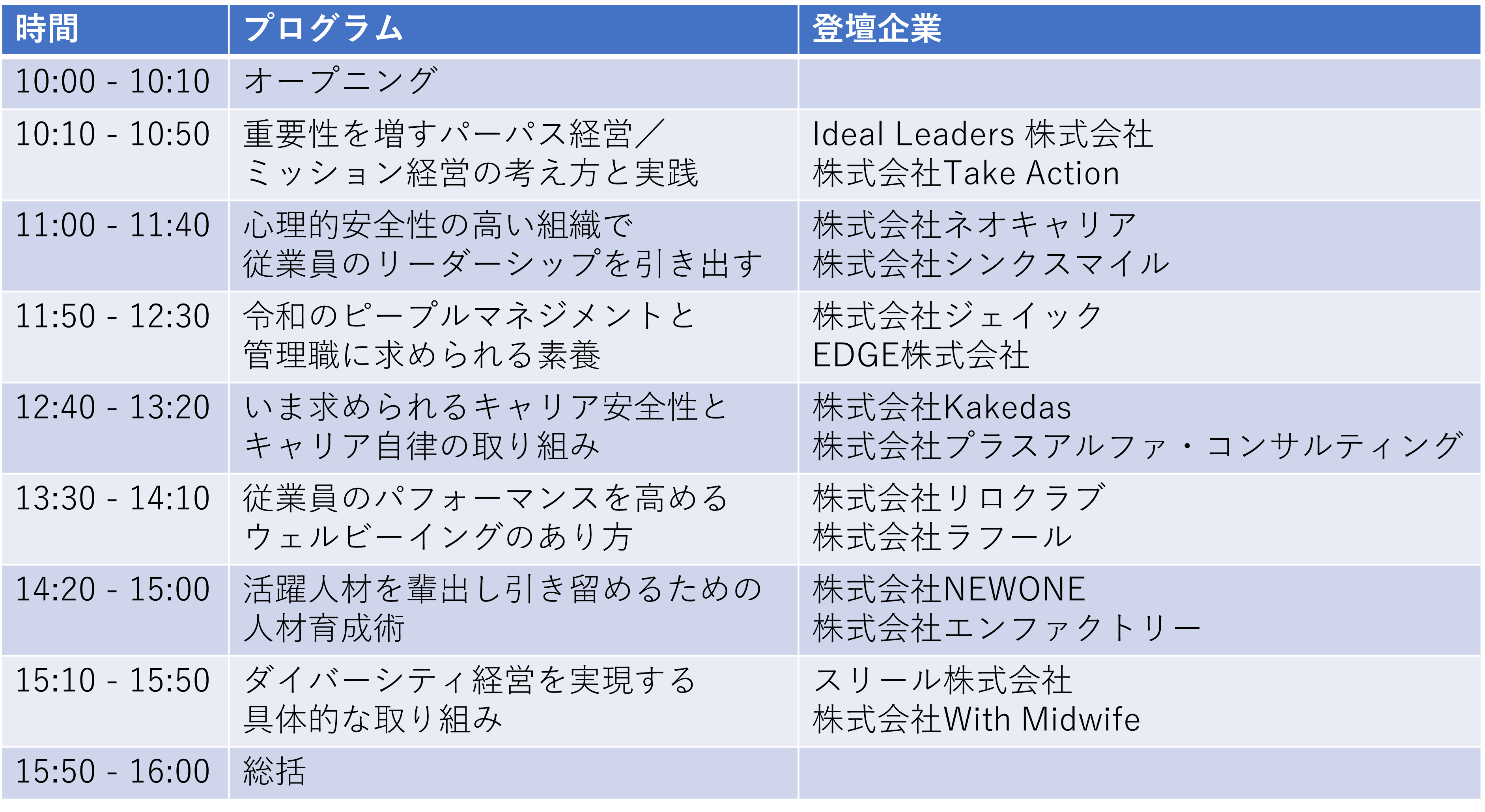 当日は、パーパス経営や心理的安全性、リーダーシップのリスキリング、ダイバーシティ経営などをテーマとする7つのプログラムを実施します。各プログラムに2名が登壇し、先端事例や導入の具体施策、実務的なノウハウをご紹介します。参加費は無料です。