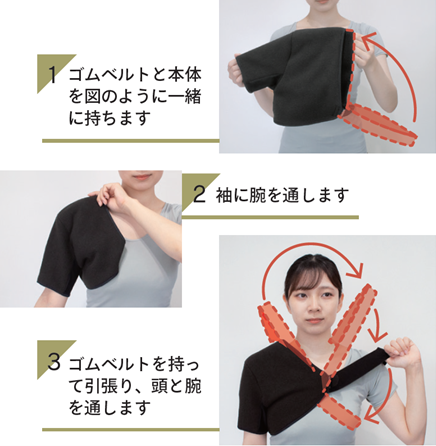 可動域が狭く動かしにくい方のために、装着しやすい形状にこだわりました。3ステップで違和感のある箇所を動かさずに着脱ができます。