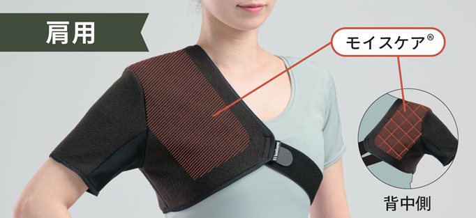 吸湿発熱素材である「モイスケア®」を肩の前後に配置し、肩周辺をしっかりと温める構造です。温めることで筋肉をやわらかくし、肩のお悩みに寄り添います。