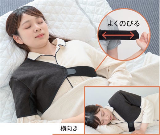 肩の違和感で目が覚めるなど、就寝時のトラブルについて多くご要望をいただき、就寝時にも使用できるようゆったりとした設計にしました。脇の下には伸縮素材を採用しており、横向きや寝返りも快適です。