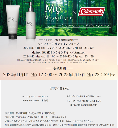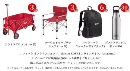 公式ECサイト『マニフィークオンラインショップ』の開設に合わせて、対象商品2点のセット商品を購入した方全員にアウトドアブランド『Coleman』とのコラボレーションしたポーチをプレゼントするキャンペーンを実施します。アウトドアで「家族」「仲間」「自然」が触れ合うことで生まれる心のつながりを大切にしている『Coleman』とコラボレーションした総柄デザイン限定ポーチです。さらに対象商品を購入した方の中から抽選で42名の方に『Coleman』豪華人気商品をプレゼントします。
