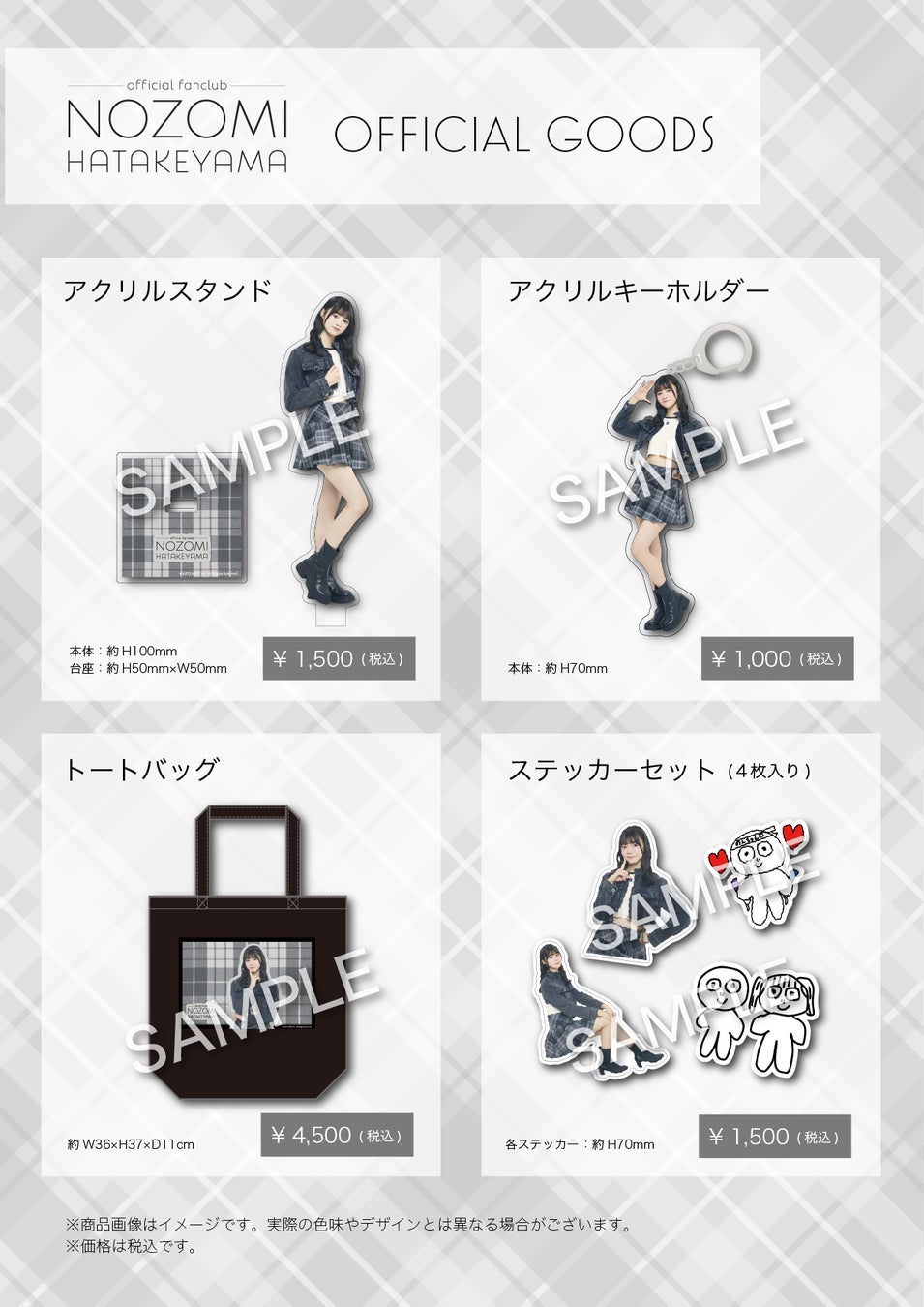 記念すべき初のオフィシャルグッズには、ファンクラブメインビジュアルのアザーカットを用いた“アクリルスタンド”や、“トートバッグ”など、畠山希美こだわりのアイテムを多数ご用意しました。