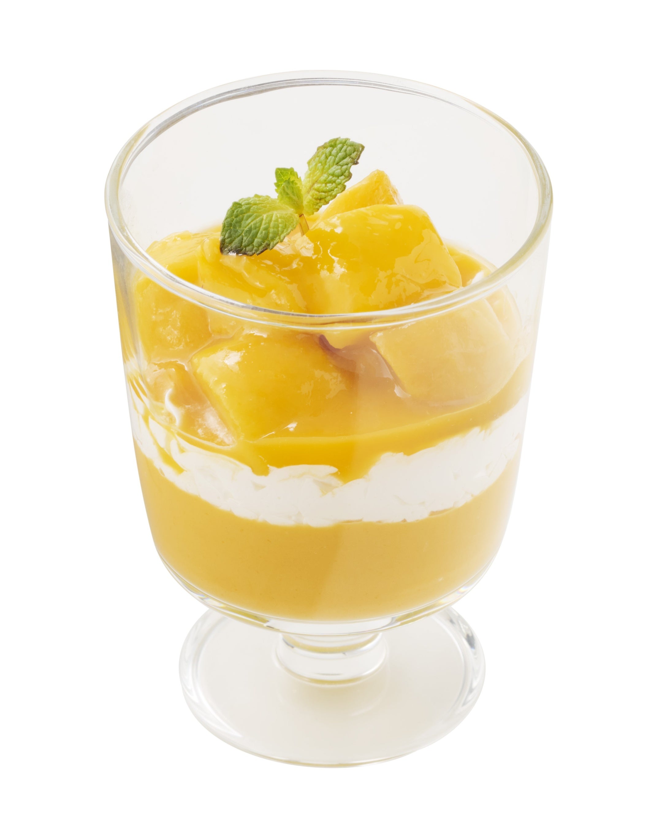 マンゴープリンの上にホイップクリーム、マンゴー果肉をたっぷりのせた贅沢なプリンパフェ。