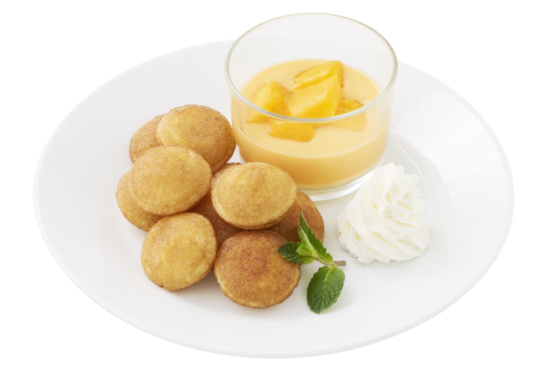 一口サイズのミニパンケーキを、果肉たっぷりの甘いマンゴーソースにディップしながら食べる、楽しいパンケーキ。