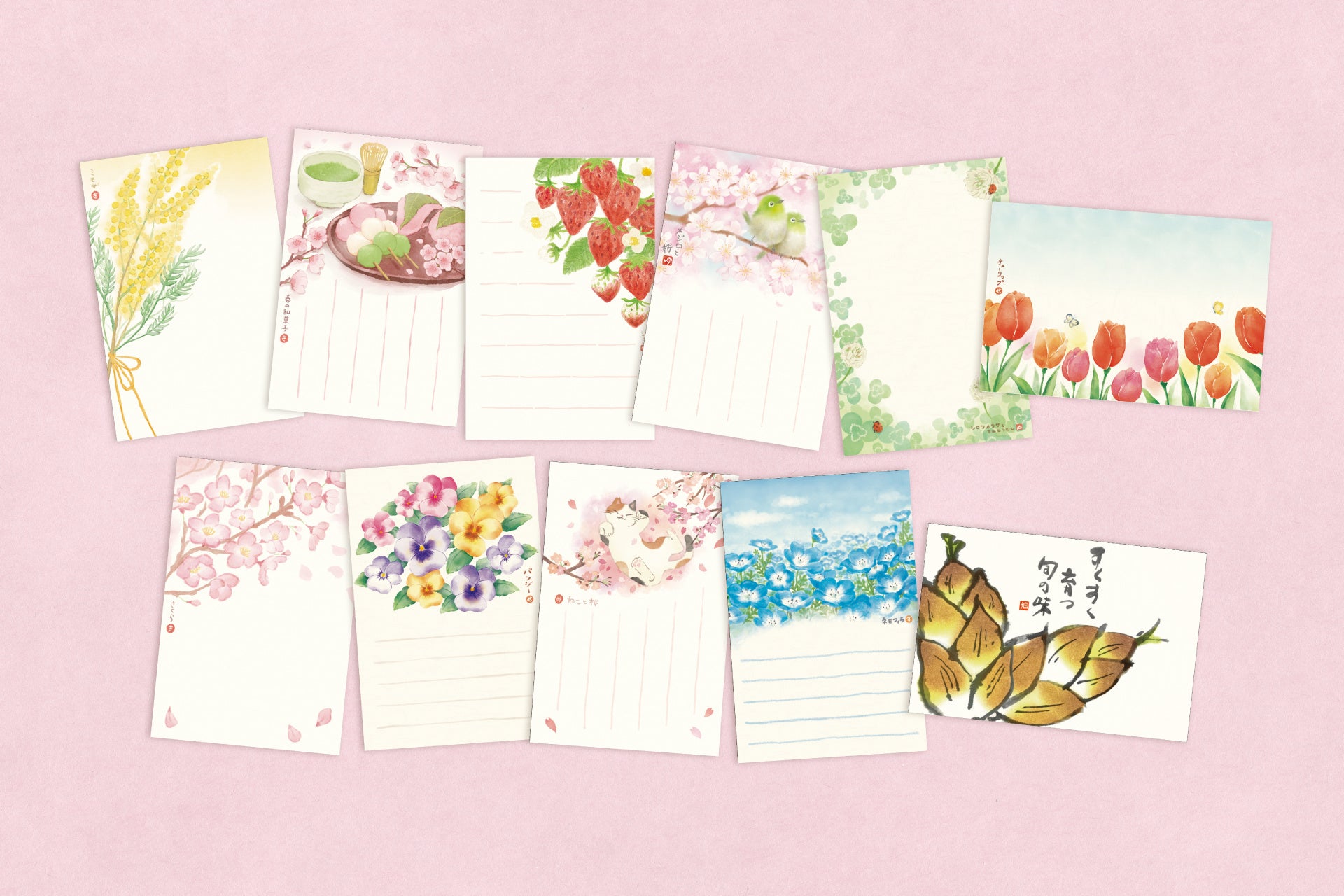 桜や草花、芽吹きの季節を感じさせるモチーフで、心弾む春の情景を一枚のはがきに閉じ込めました。