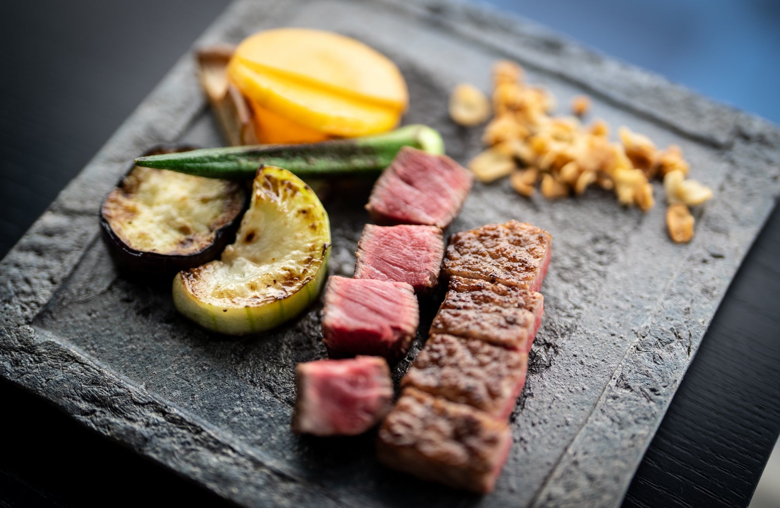 豪華さと満足感、ワクワクをテーマに鉄板焼きのコースを組み立てています。 和牛フィレと鮑をメイン食材に、沖縄産の野菜もふんだんに取り入れた鉄板焼きをお楽しみください。