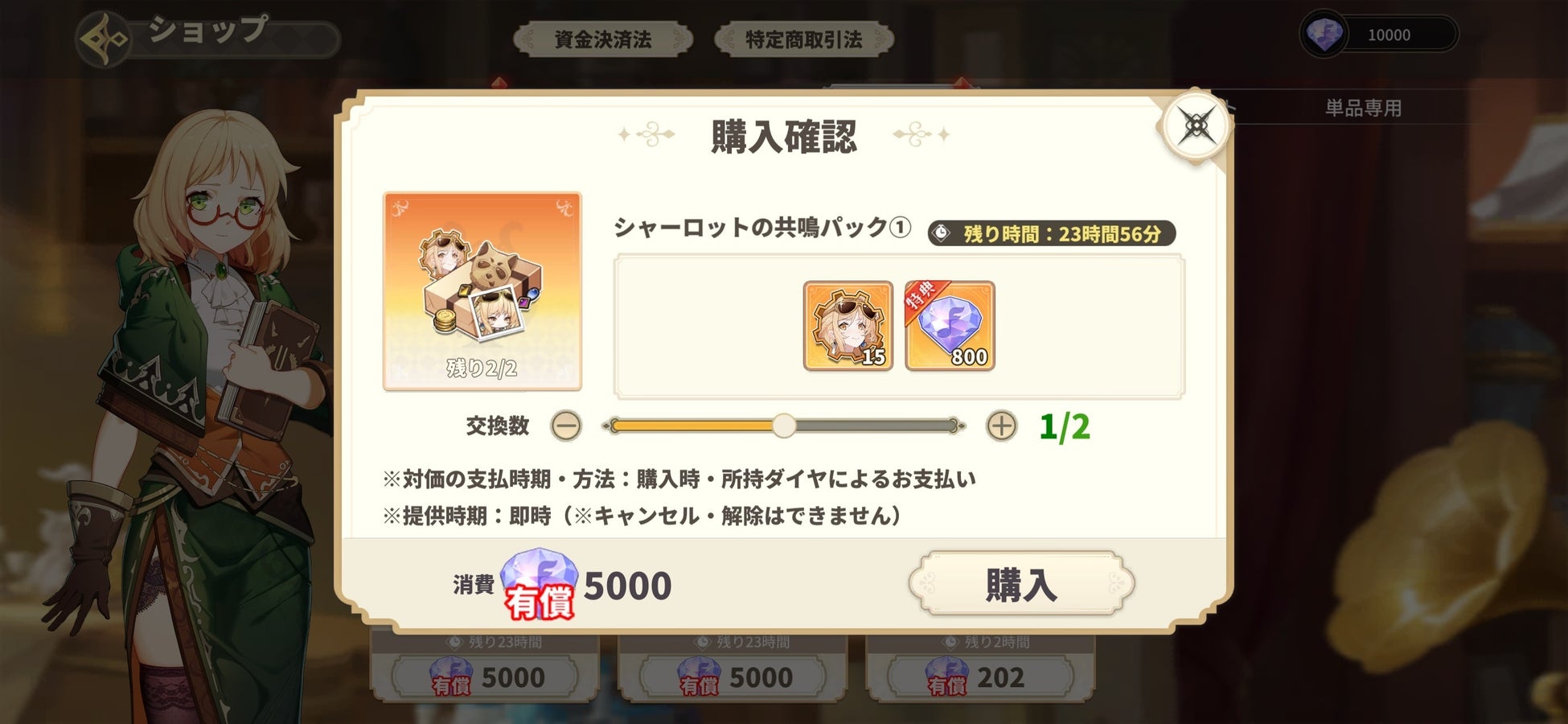 「ミユ」もしくは「シャーロット」を初めてガチャにて獲得した際、24時間だけ購入可能な「共鳴パック」を【ショップ】にて販売いたします。