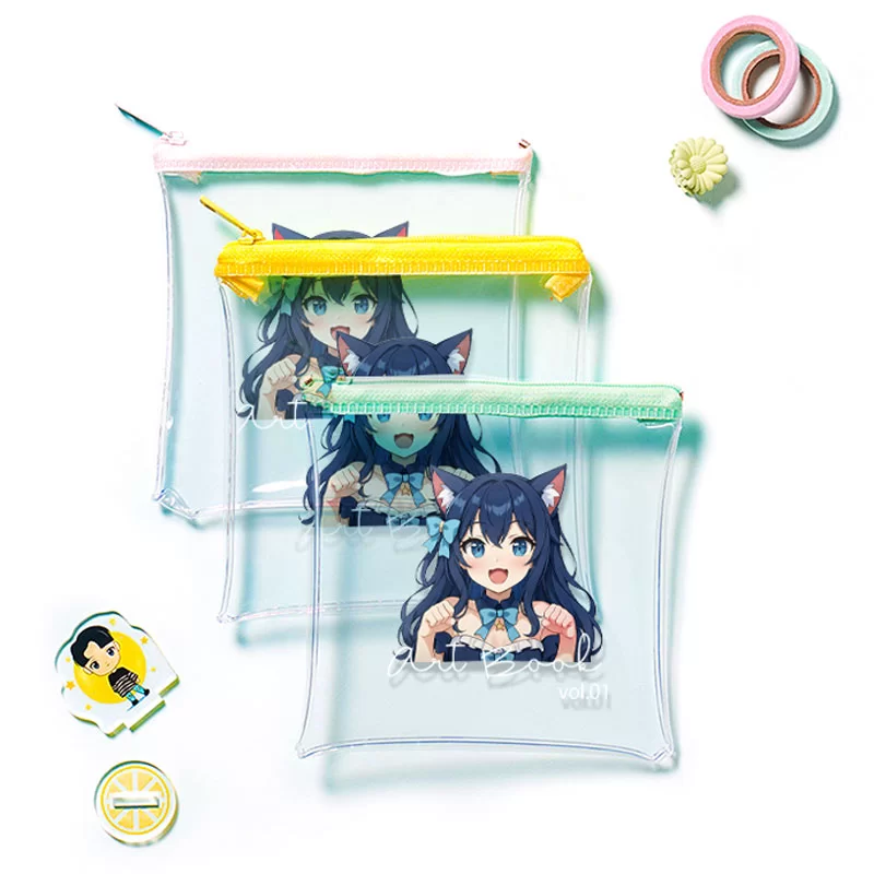 本商品は、PVC素材を使用した透明タイプのポーチで、防水性と耐久性に優れています。ファスナー部分にだけカラーを配したシンプルながらもおしゃれなデザインが特徴。フルカラー印刷に対応しており、キャラクターやブランドロゴ、チームエンブレムなども高精細に再現可能です。