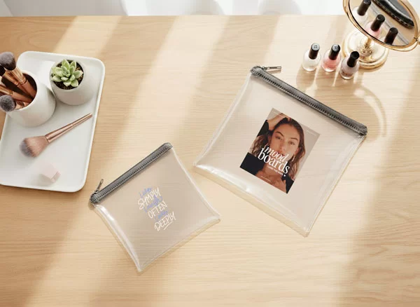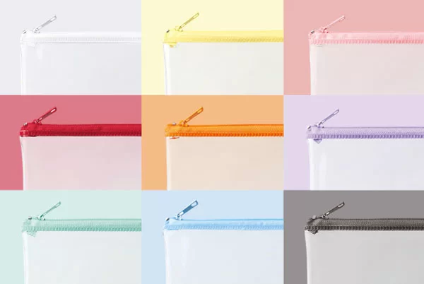PVC素材で丈夫&防水!カラフルなファスナーがアクセントのクリアポーチを、販促・ノベルティ・ファングッズ・記念品にぴったりなデザインで作成できます。