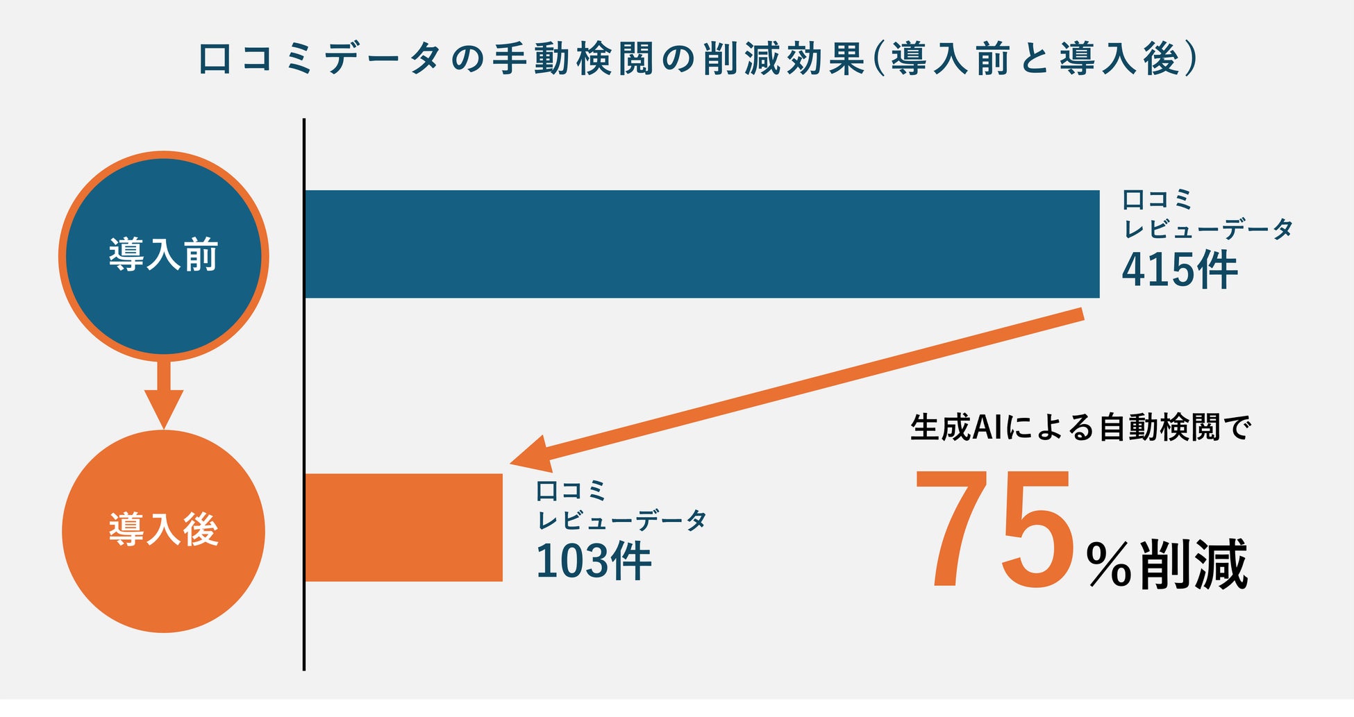 結果として、集められた415件の口コミデータのうち、生成AIを活用した自動検閲で約75%の削減効果を達成し、手動検閲の数を103件まで減らすことに成功しました。