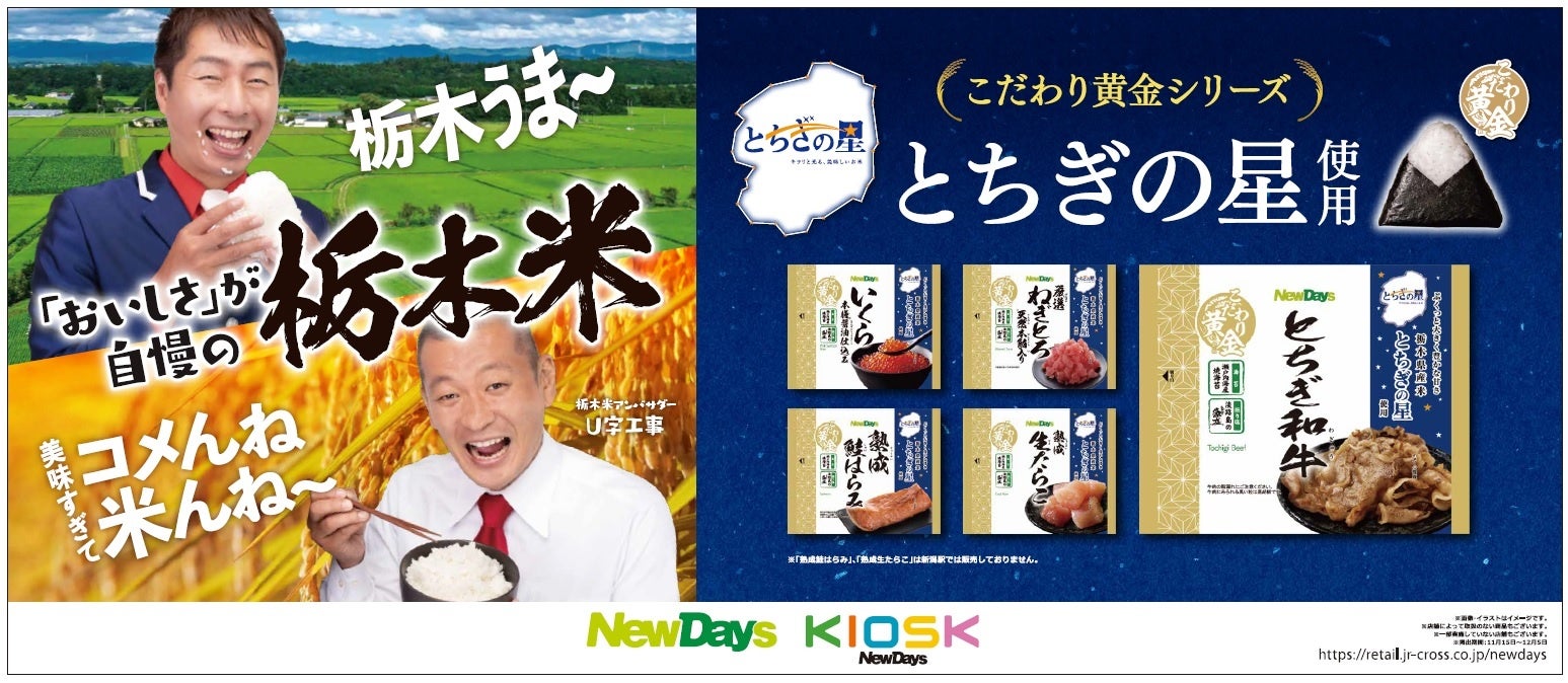 ●株式会社JR東日本クロスステーション リテールカンパニー(所在地:東京都渋谷区、カンパニー長:白石 敏男)が運営する「NewDays」「NewDays KIOSK」では、プライベートブランドのおにぎり「こだわり黄金(こがね)」シリーズにおいて、昨年も発売し大好評であった、栃木県のオリジナル品種米「とちぎの星」を使用したおにぎりを11月15日(火)から期間限定で販売いたします。