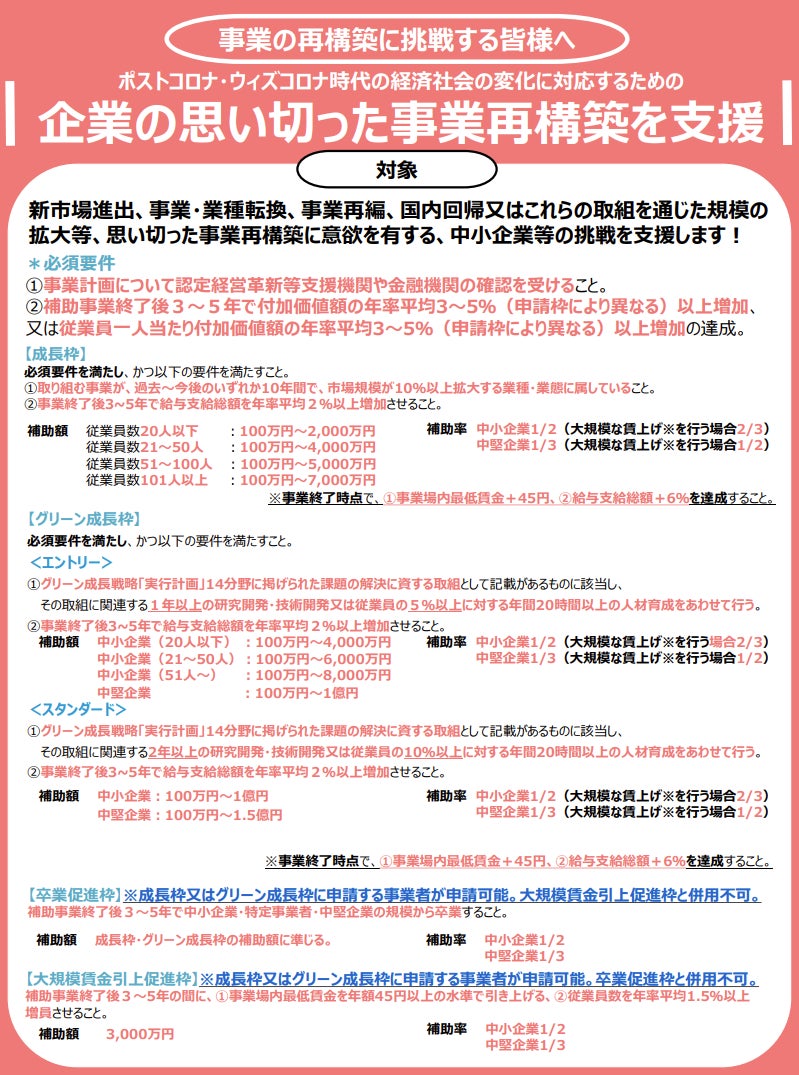 新型コロナウイルス感染症の影響が長期化し、当面の需要や売り上げの回復が期待しづらい中、ポストコロナ・ウィズコロナ時代の経済社会の変化に対応するために新分野展開、事業転換、業種転換、業態転換、又は事業再編という思い切った事業再構築に意欲を有する中小企業等の挑戦を支援する補助金。
