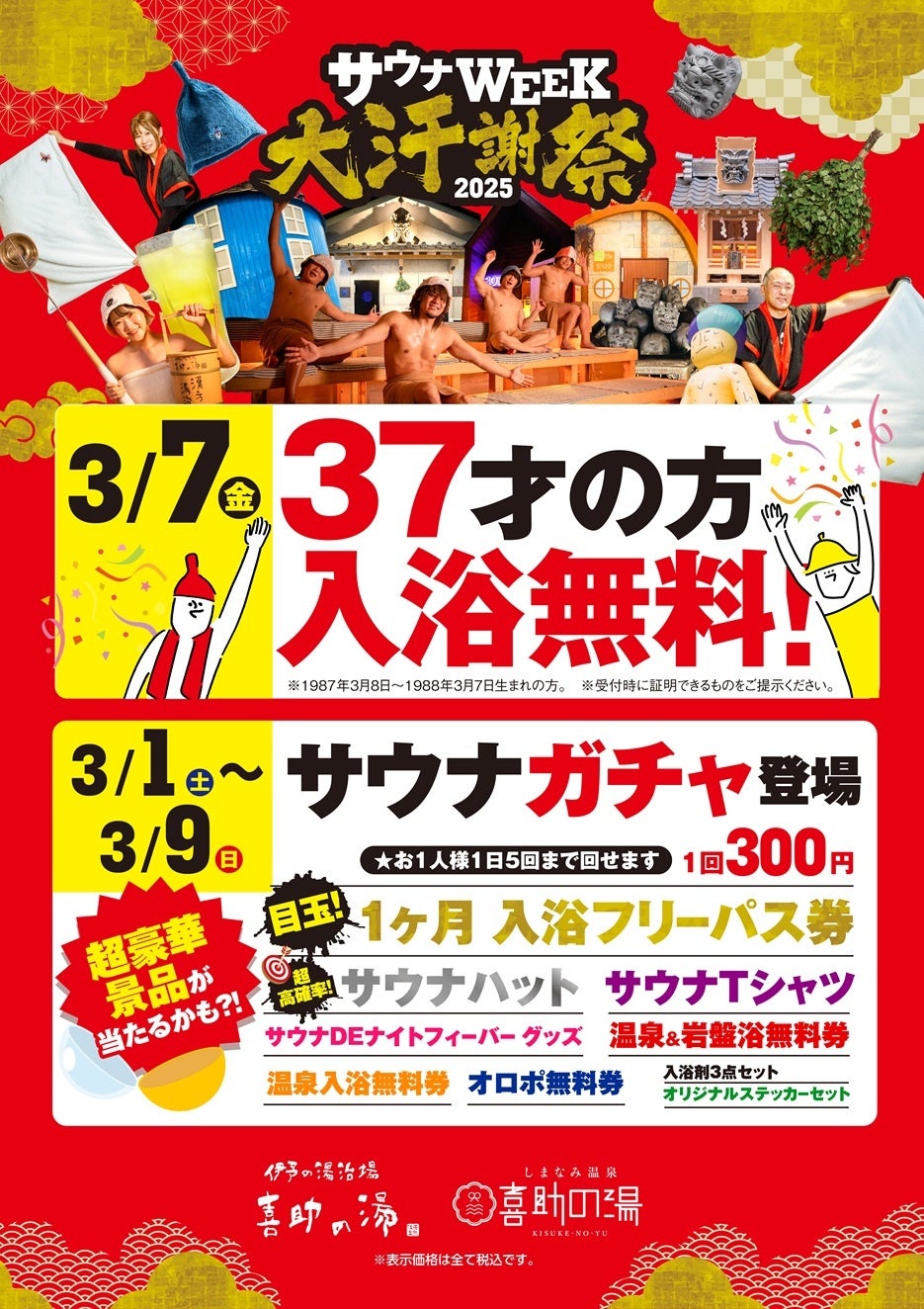 【 喜助の湯 】今年もやります!サウナWEEK 大汗謝祭!!3月7日(サウナの日)は37才無料・アジャコングや五塔熱子さんも登場【 愛媛県 】