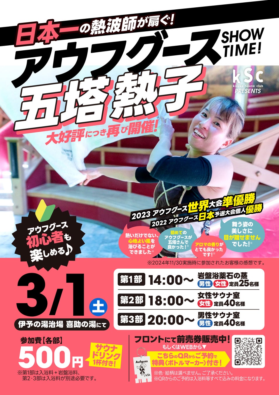 2023 アウフグース世界大会準優勝の経歴を持つ、日本一の熱波師 五塔熱子さん が登場し、アウフグースショーを開催!14:00~、18:00~、20:00~の3部構成で、究極のサウナ体験を提供します。