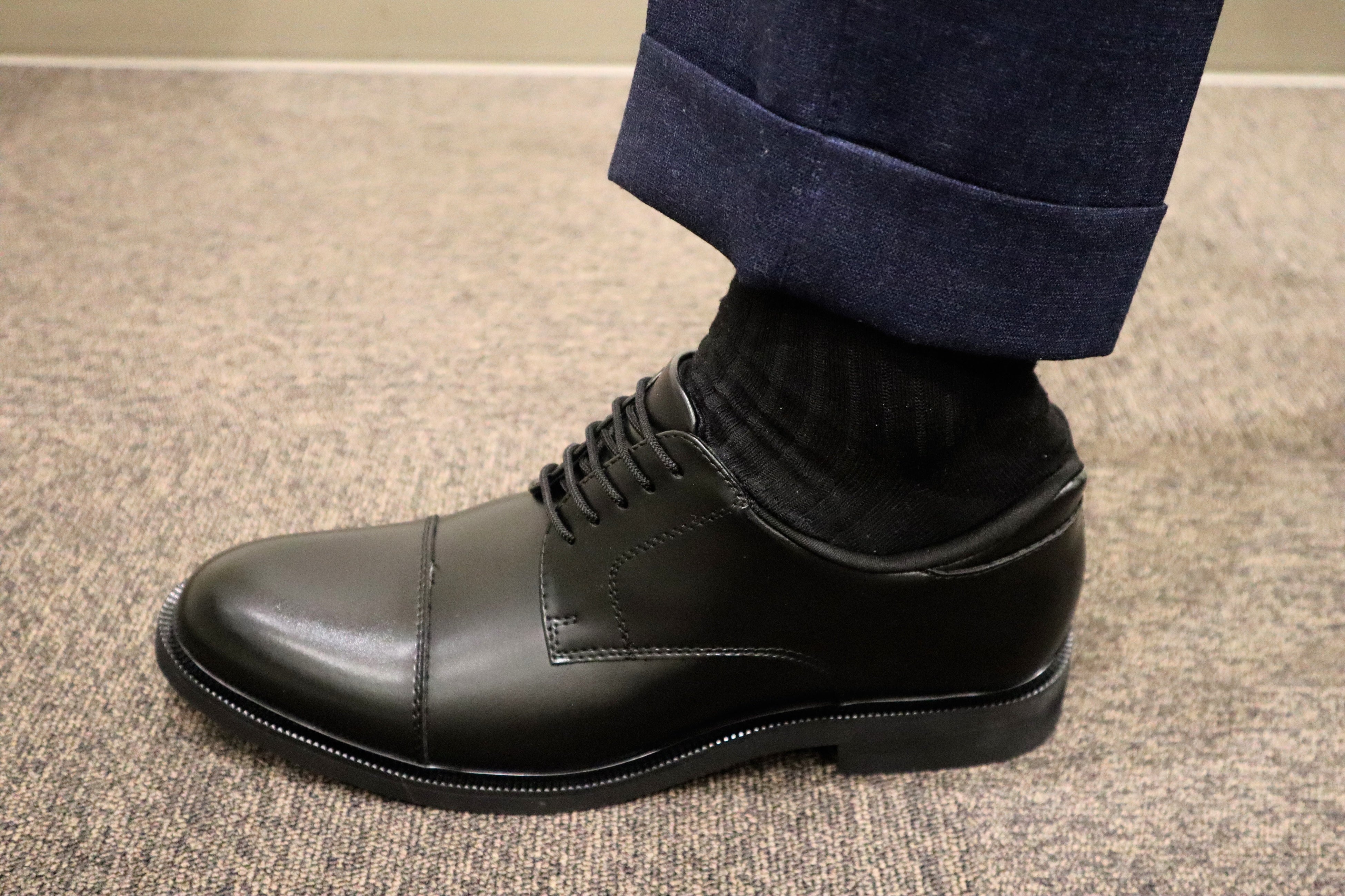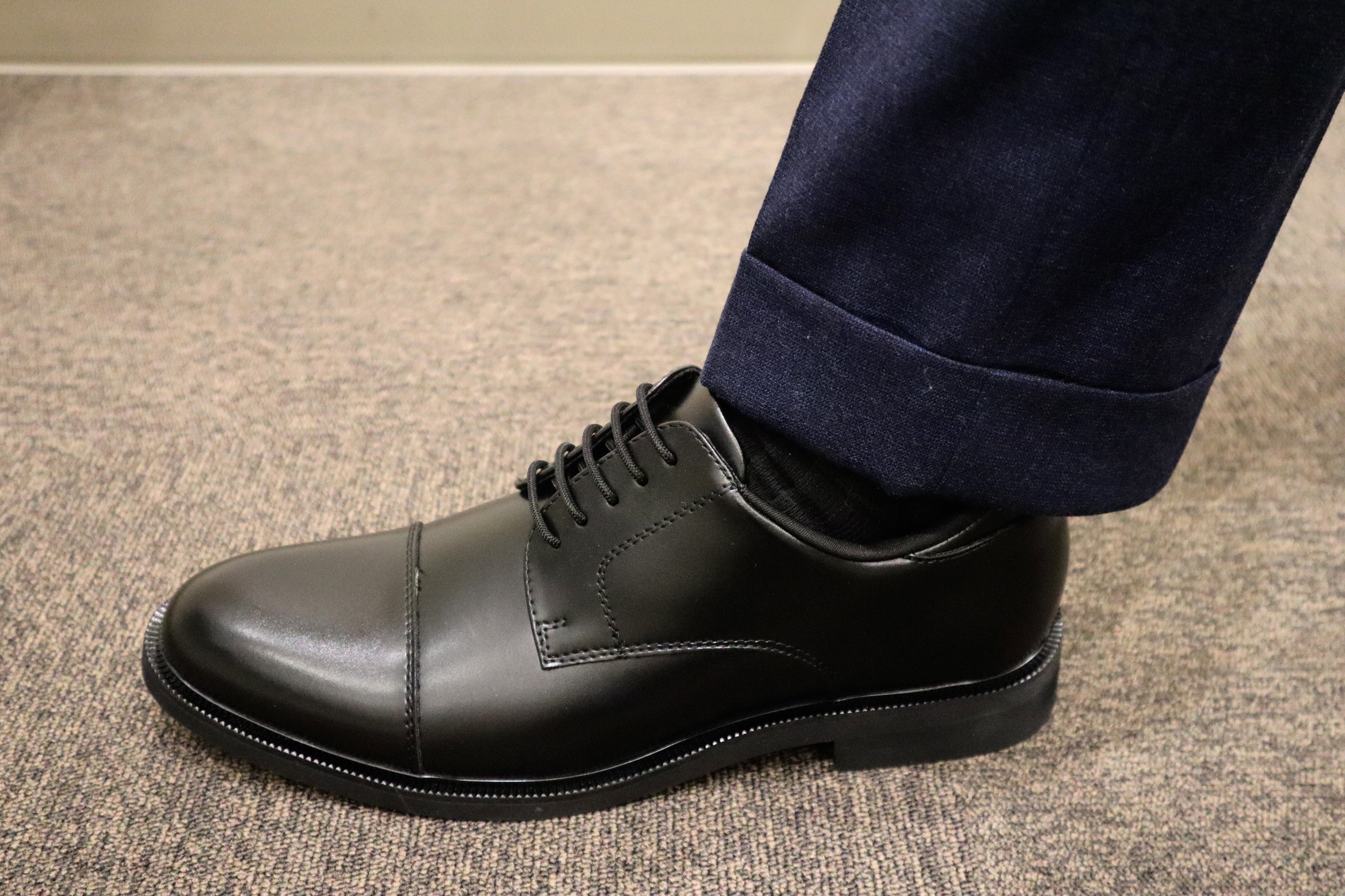 「ゼロプレッシャーシリーズ」からドレス仕様のシューズを企画する上で、何の要素を加えればコンセプトに合うかと考えていました。そのような中で、今市場で大ヒットしているハンズフリーのビジネスシューズを作りたいと考え、今回はダイマツ様のスライドフィットを採用。かかとの出っ張りが低く、パンツの裾が引っかかりにくいのが特徴で、見た目も普通のビジネスシューズと変わらないデザインにしています。