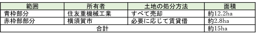 令和6年3月に、住友重機械工業と本市が締結した協定を踏まえ、この度、住友重機械工業所有地(約12.2ha)と既に寄付でいただいている市有地(2.8ha)の約15haを一体的に活用した賑わいづくりを目的とした、浦賀駅前周辺地区の活性化に関する開発を担うパートナー事業者の公募を実施します。