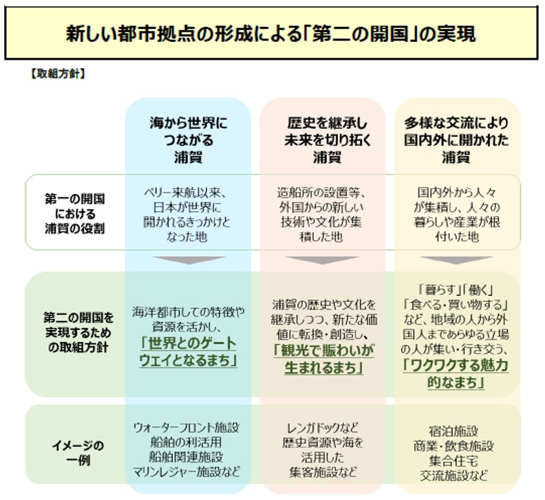 浦賀ドックを中心とした市有地及び民有地において、近代日本の発祥の地である歴史・文化を生かした観光拠点を形成するとともに、多様な都市機能の集積や海辺の空間の魅力創出により、本市の新たな集客・交流拠点として、まちの持続的なにぎわいの創出を目指します。