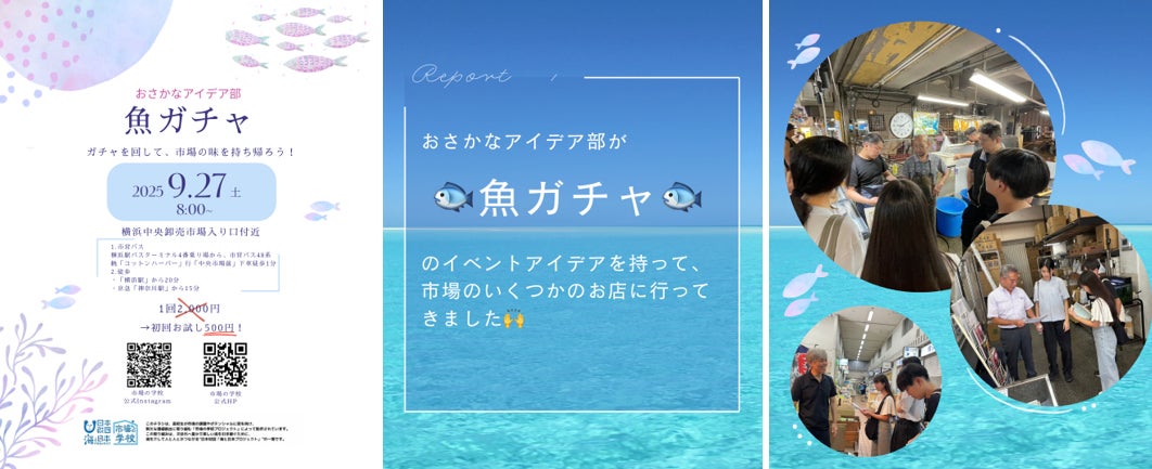 活動内容 :「市場の学校プロジェクト」は、横浜中央卸売市場を舞台に高校生が主体となって地域活性化に取り組む活動です。今後は、魚の魅力を楽しく伝える「魚ガチャ」の企画のほかにも、地域や飲食店と連携し、市場の魅力発信と地域との交流を深めていきます。