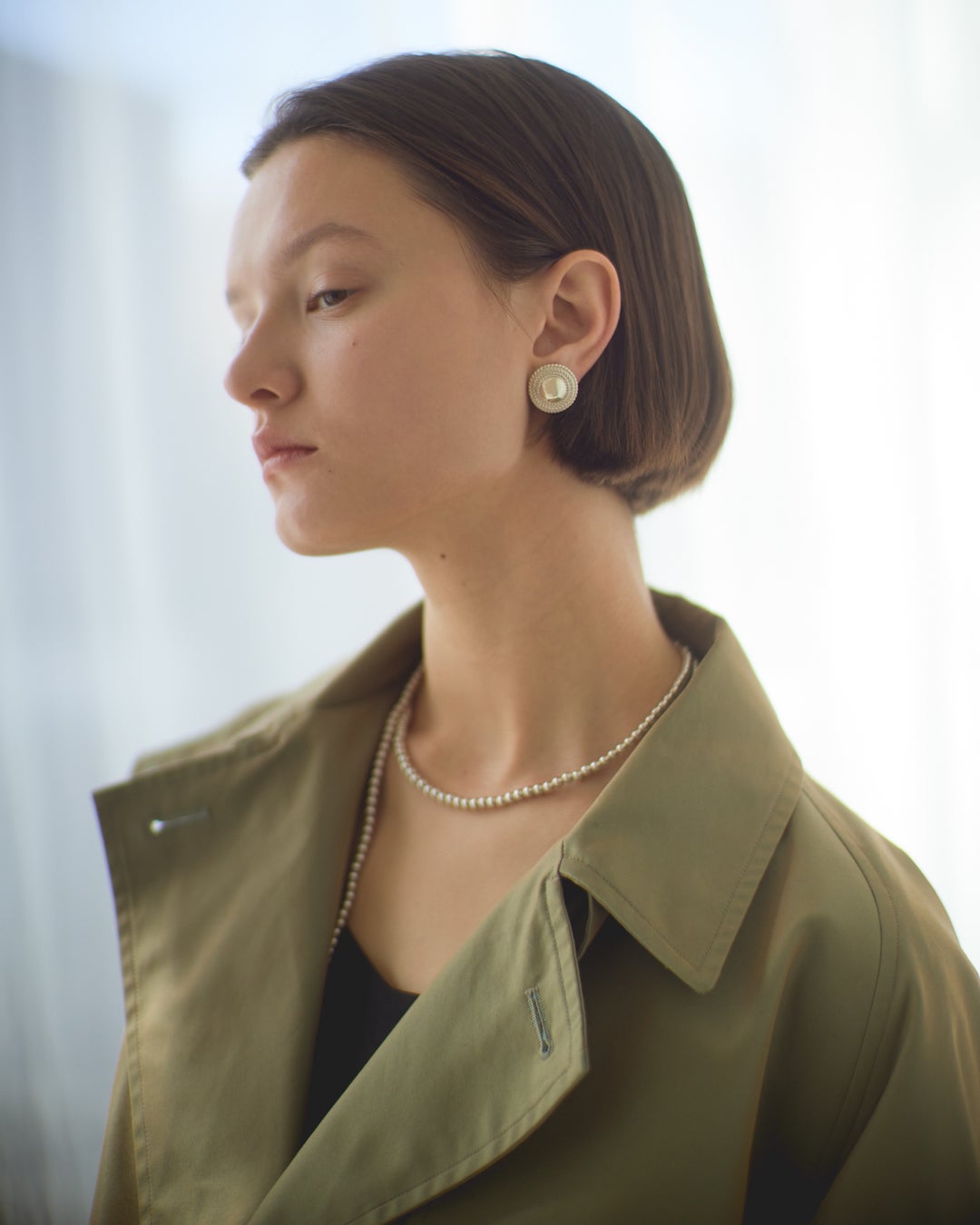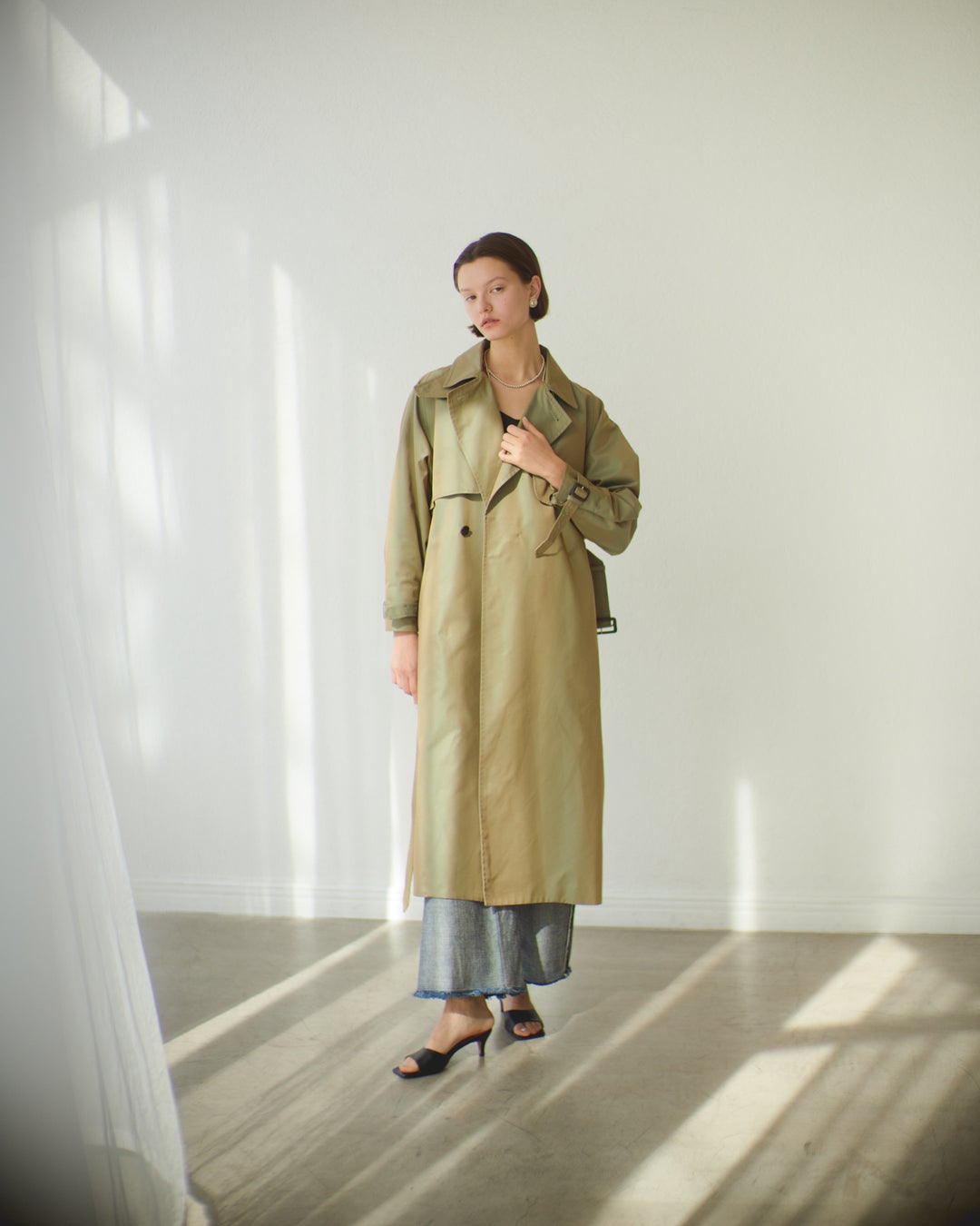 〈Aresence〉の春の代名詞であるトレンチコート。今シーズンは新たに玉虫色を加えてブラッシュアップ。太めのロールアップがこなれた雰囲気を演出してくれる〈LIVINGTONE〉のデニムパンツは、トラッドな装いのアクセントに。インナーにはあえてサテン地のキャミソールをインして、コーディネートにほんのりと艶めきを。