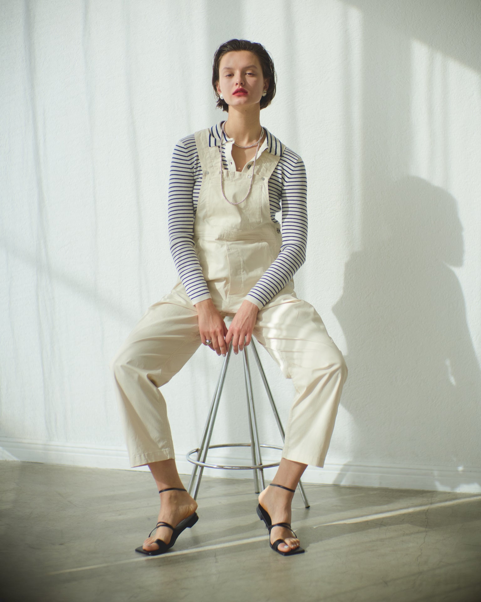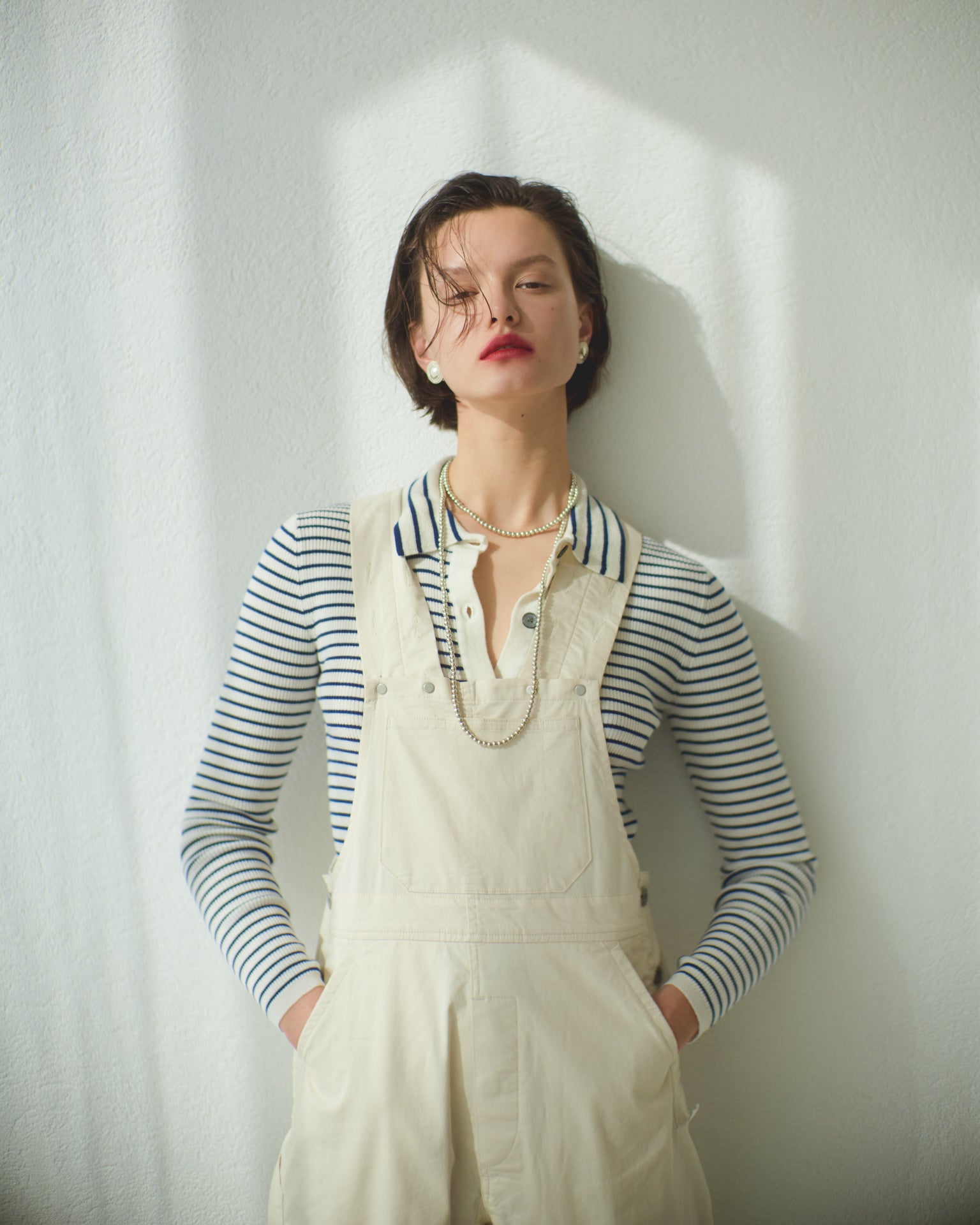50年代のヴィンテージオーバーオールからインスパイアを受けたオーバーオールは、〈WHITE FIELD〉の別注品。ワークウェアの骨太なムードを取り入れながらも、すっきりとした身幅や背面の空き具合など、レディライクな要素をプラス。カジュアルになりすぎない細いピッチがポイントの〈DEMYLEE〉のボーダーニットを合わせてフレンチシックなスタイルに。