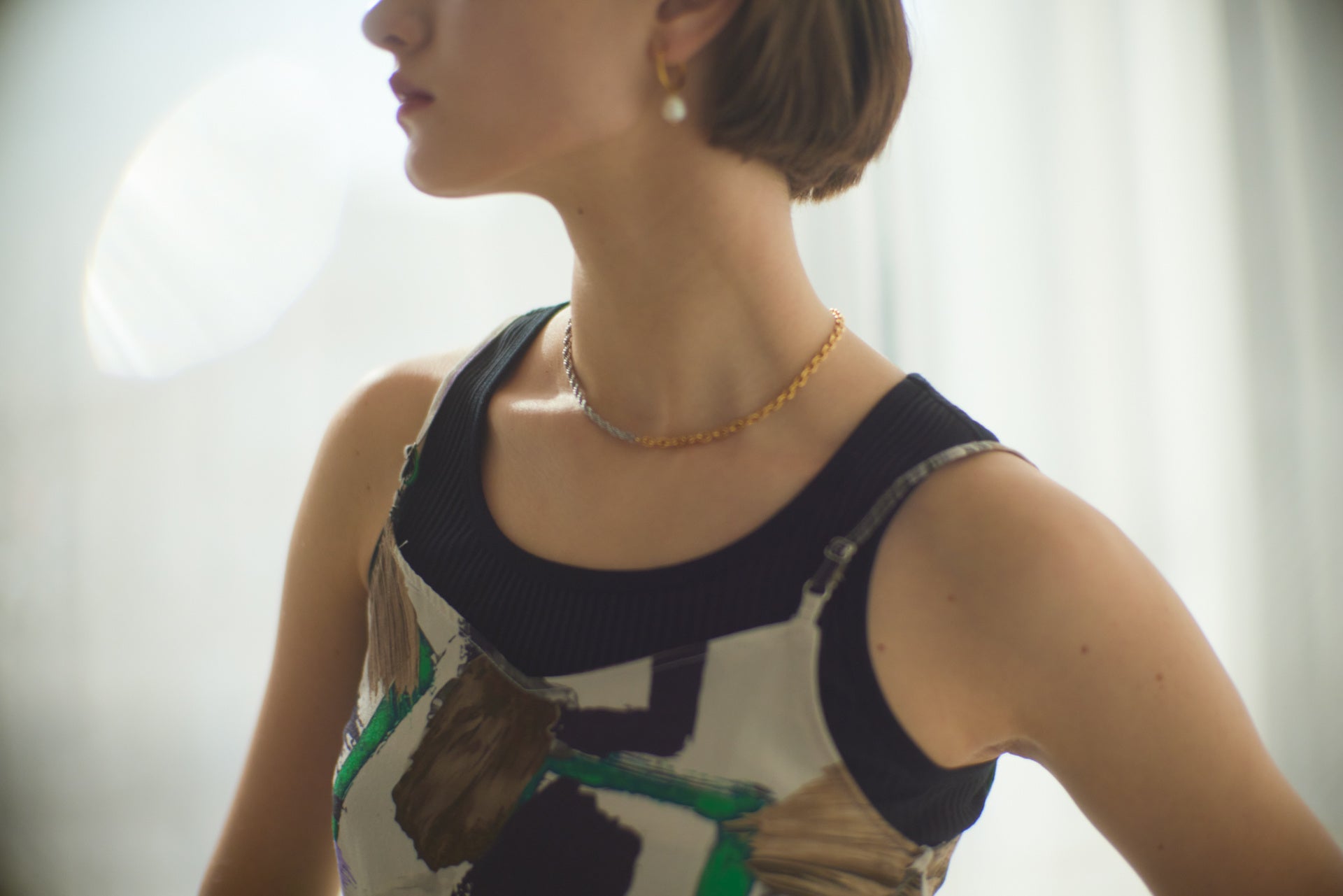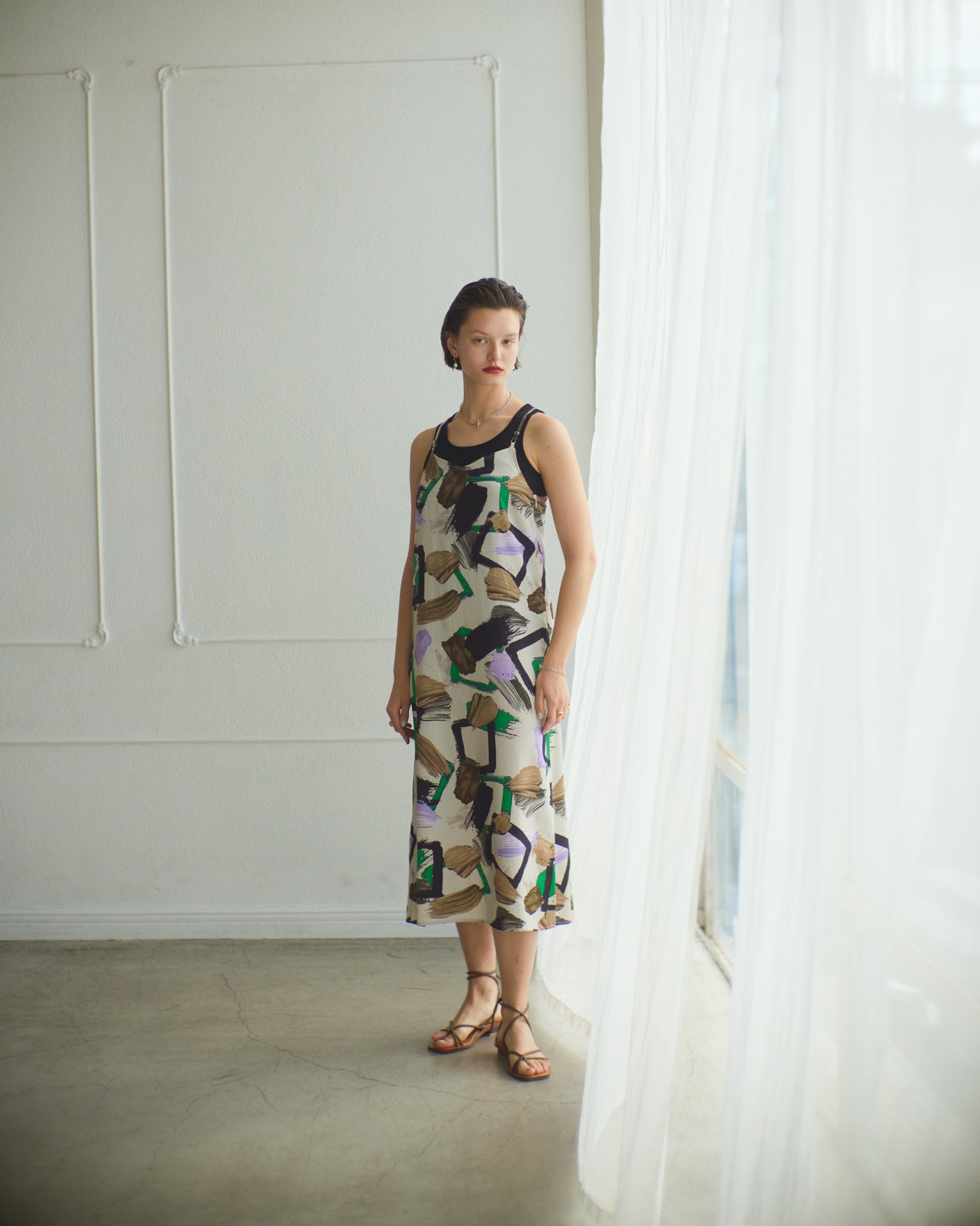 ワンピースをキャンバスに、水彩画を描いたアーティスティックな一枚。フランスのテキスタイルメーカー〈Paris Authentique〉に別注したオリジナルプリントで、春の軽やかな気分をさらに盛り上げてくれるはず。綿レーヨンを使用した落ち感が洗練した空気感を添え、すっきりとした着こなしに。後ろにはスリットも入り、足捌きも抜群。