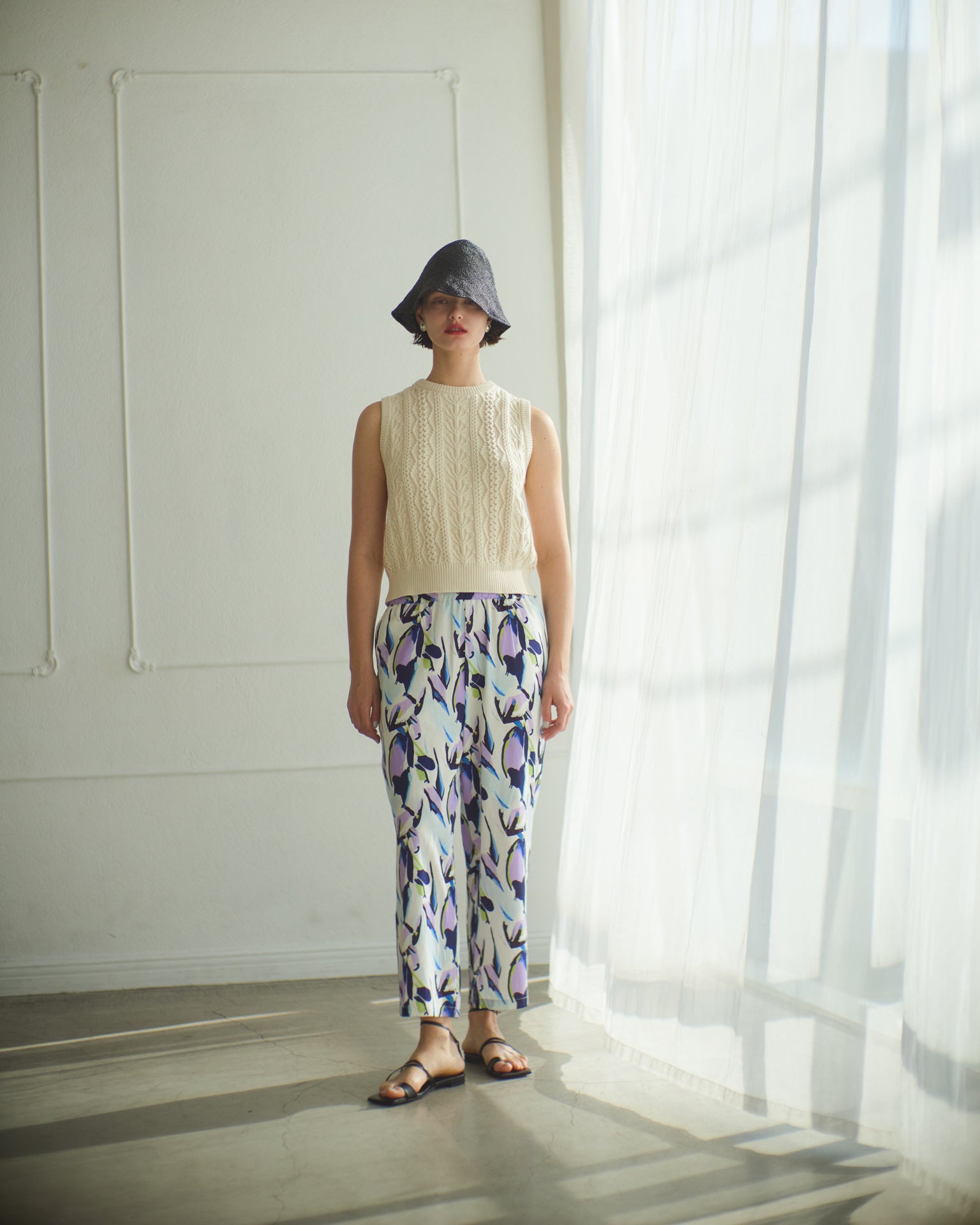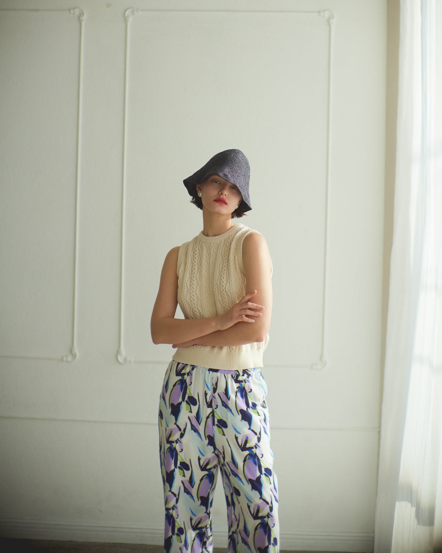 〈Paris Authentique〉のオリジナルプリントを使用した柄パンツは、〈Aresense〉のフィルターを通して大人でも楽しめる一本に。ウエストがゴム仕様のイージーパンツながらも、両サイドに施したパイピングや、ファスナーがあるようなデザインで、きれいめに仕上げてくれる。トップスには、〈DEMYLEE〉のケーブルニットを合わせて着こなしにメリハリを。