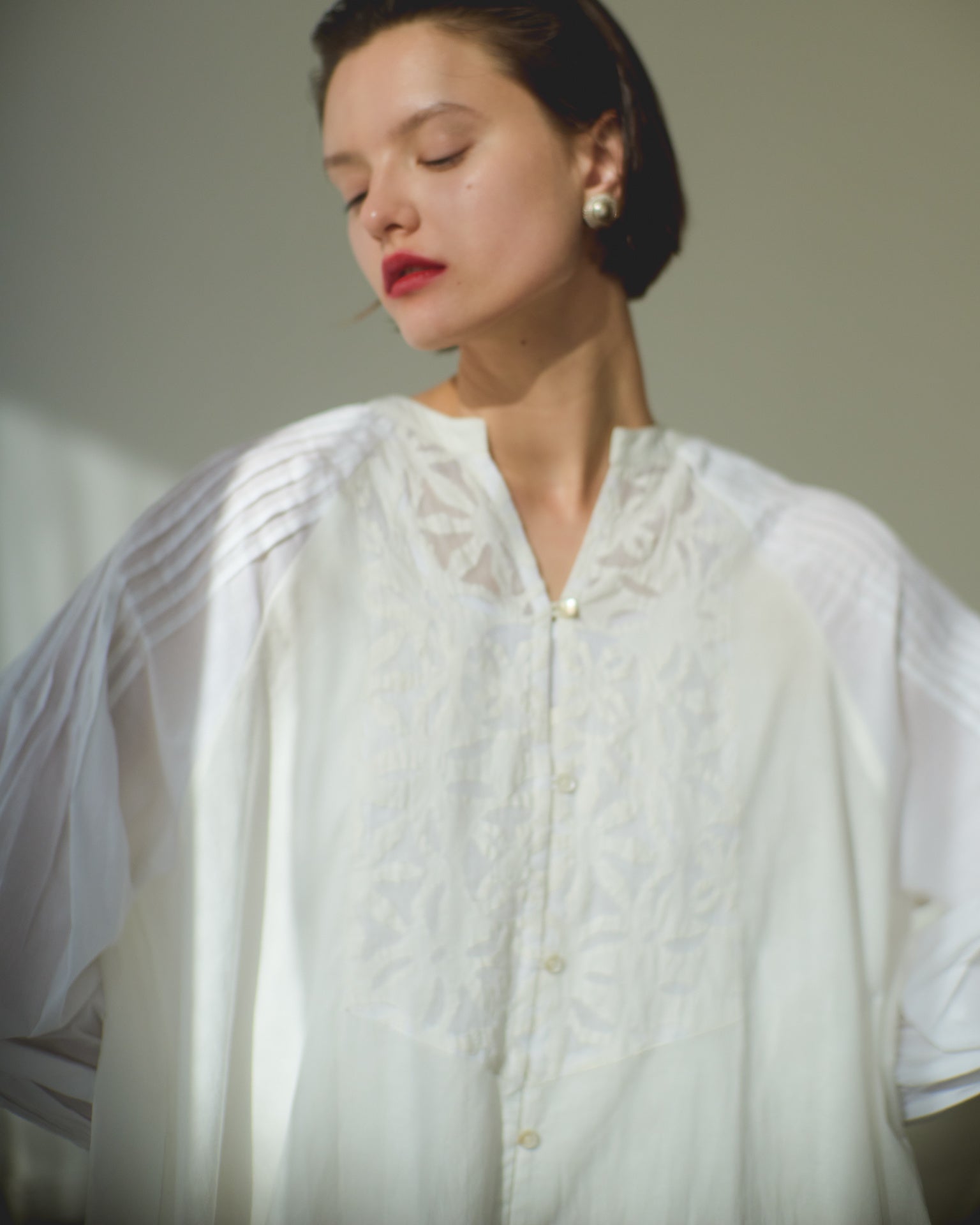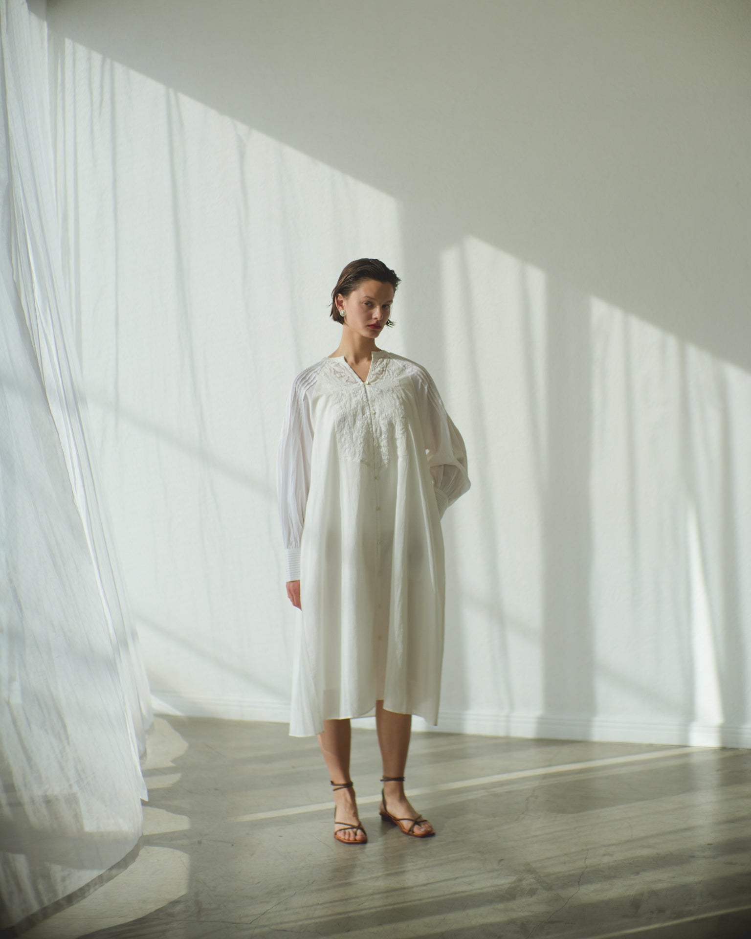 暖かな日差しに似合うのが、異国ムード漂うエスニックなワンピース。インド綿を使用し、クラシカルなデザインが特徴的。クラフト感のあるアイテムながらも、長めのカフスや、袖と肩に施されたピンタックなどのディテールが、どこか上品な印象に仕上げてくれる。フロントは裾までボタン仕様なので、羽織として着られるのも嬉しい。
