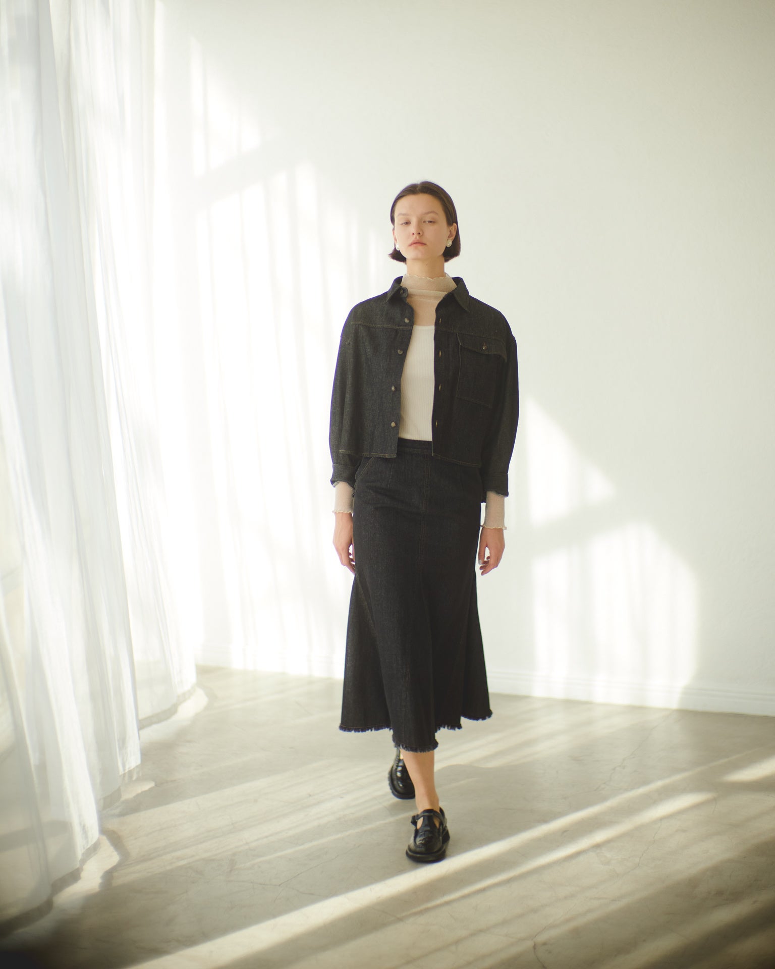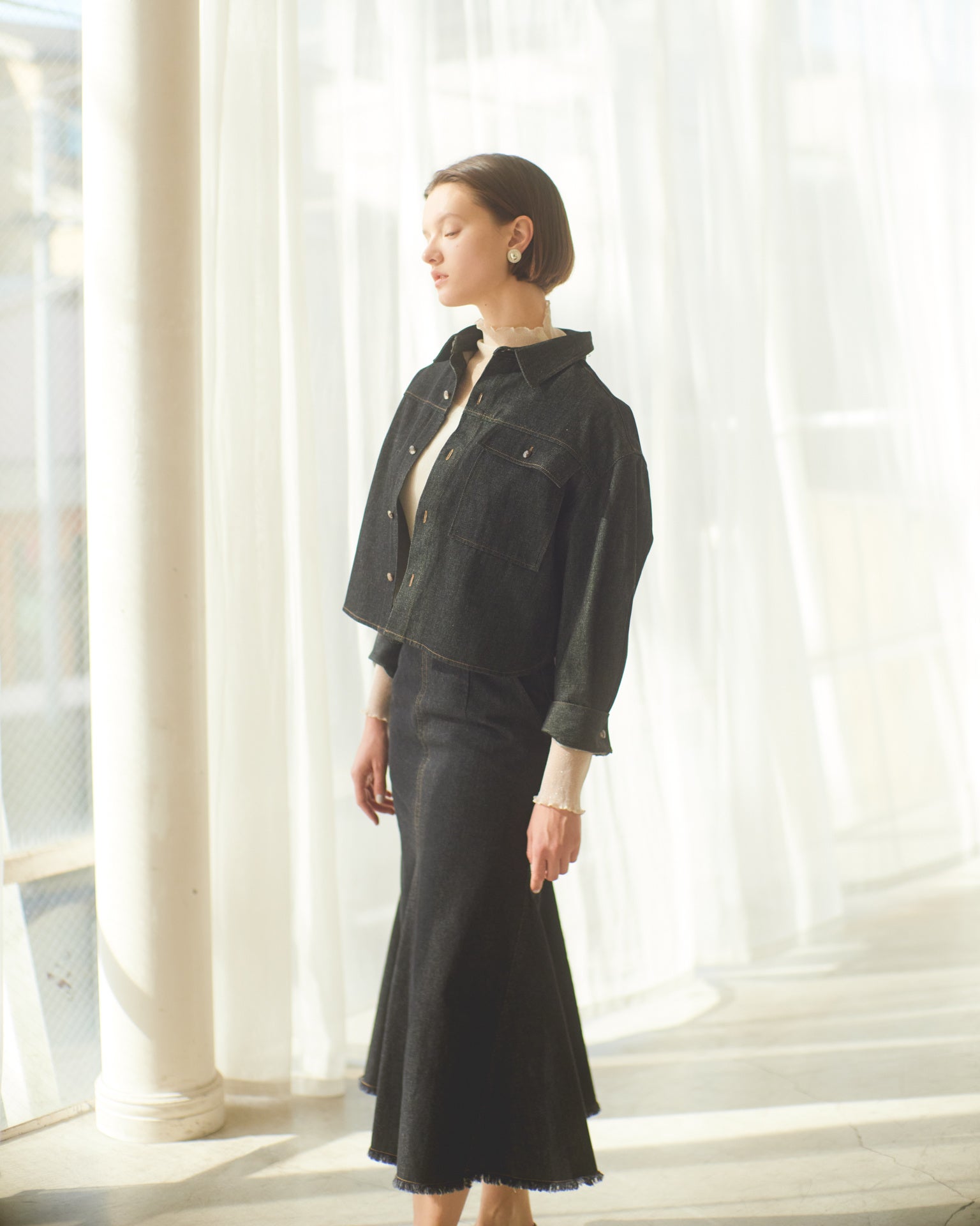 やっぱりデニムが着たくなる春。永遠に定番のアイテムだからこそ、シルエットで変化をつけて新しい季節を楽しみたい。今年のトレンドでもあるショート丈のシャツには、マーメイドラインがエレガントなスカートを合わせて、大人なデニムonデニムスタイルに。シャツの襟裏に施されたステッチや、スカート裾のフリンジでスタイリングに遊び心を加えて。