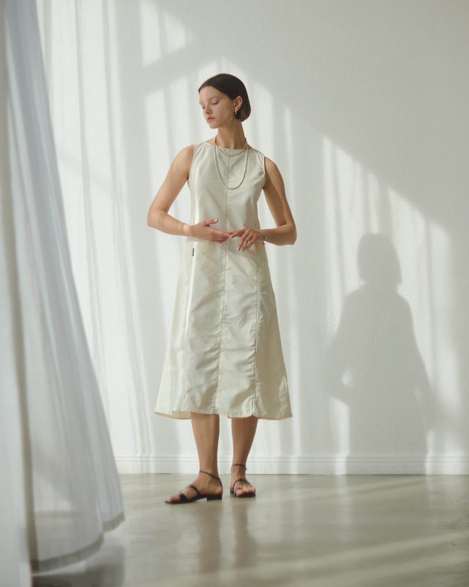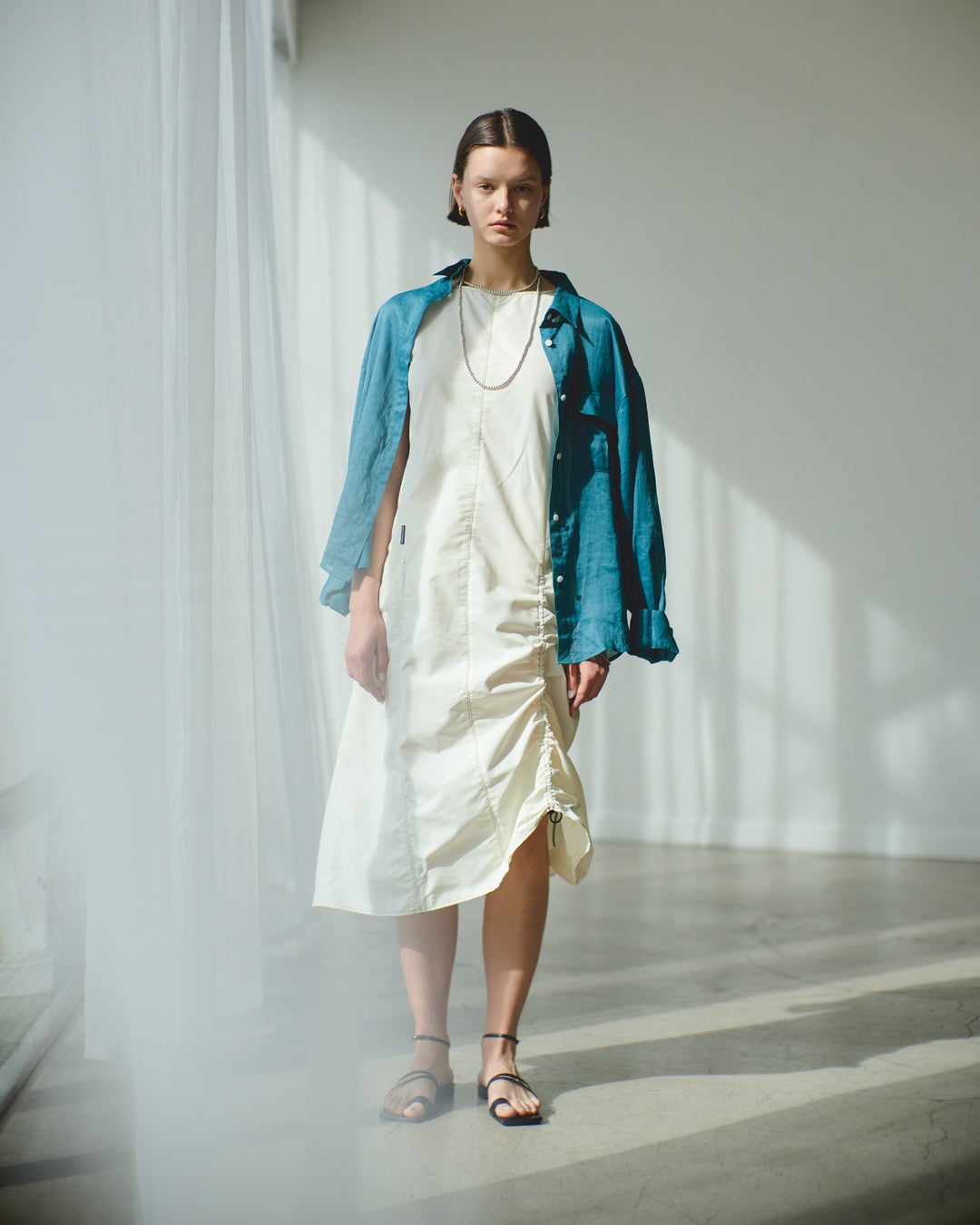 〈BURLAP OUTFITTER〉の別注ワンピースは、アウトドアシーンでも使い勝手のよいサプレックスナイロンを使用。そこに〈Aresence〉のエッセンスを散りばめて、カジュアルさとフェミニンさの絶妙なバランスが詰まった一着に。艶やかなラミー素材のシャツを羽織って、ホワイト×ブルーが奏でる爽やかなスタイリングを楽しんで。